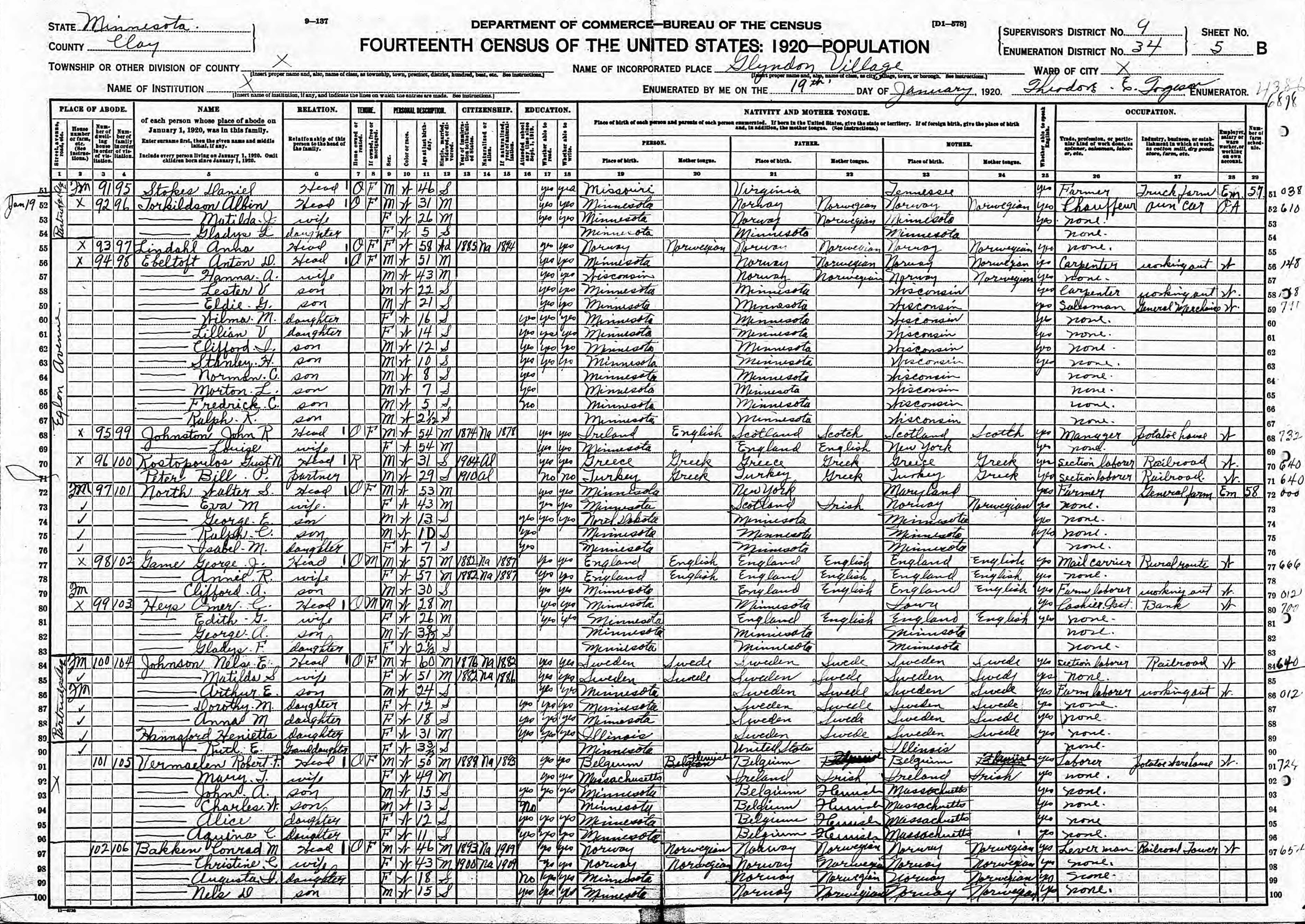 Johnson Family 1920 Federal Census Minnesota, Lines 84-88