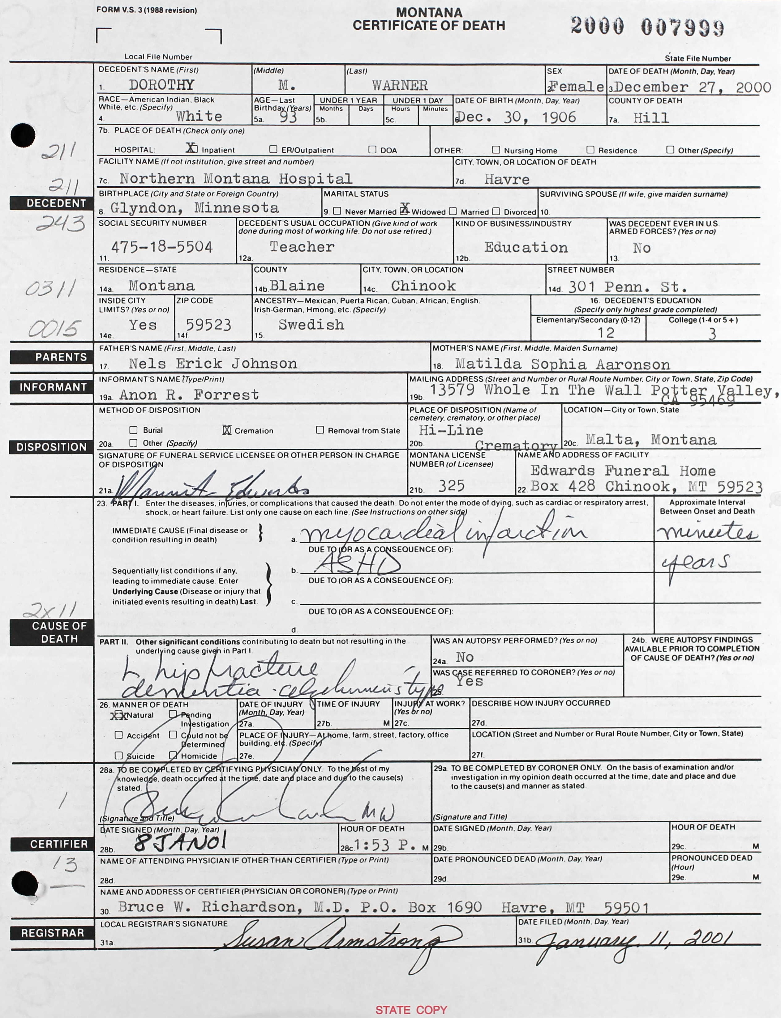 Harold Albert Warner were married. She died on December 27, 2000, at age 93, in Havre, Hill, Montana, USA. She was buried in Riverside Cemetery, Glyndon, Minnesota.