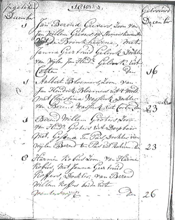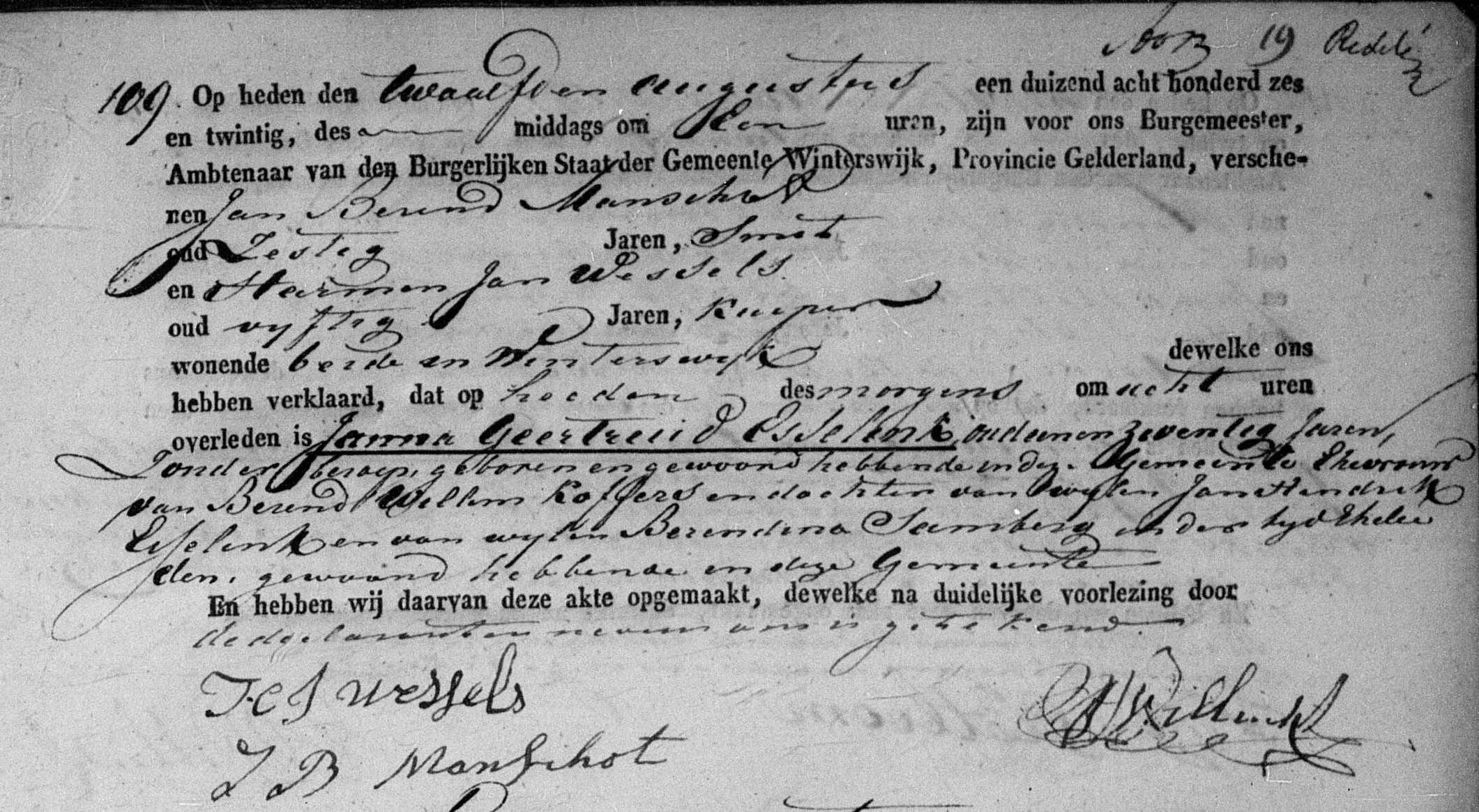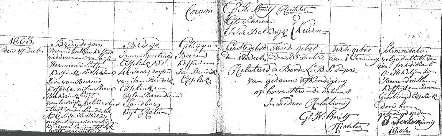 Janna Geertruid Esselink were married on December 17, 1803 in Winterswijk, Gelderland, Netherlands. He died on December 21, 1830, at age ~74, in Winterswijk, Gelderland, Netherlands.