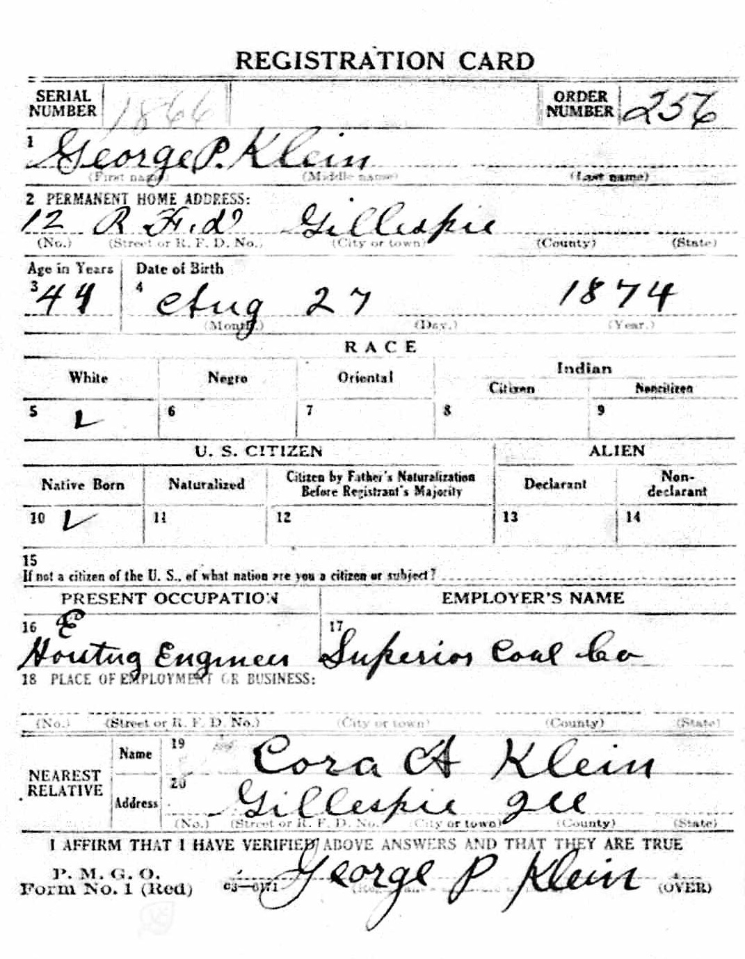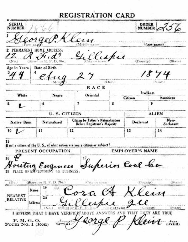 George P. Klein were married in April 1910. She died on July 28, 1956, at age 72, in Gillespie, Macoupin, Illinois, USA.