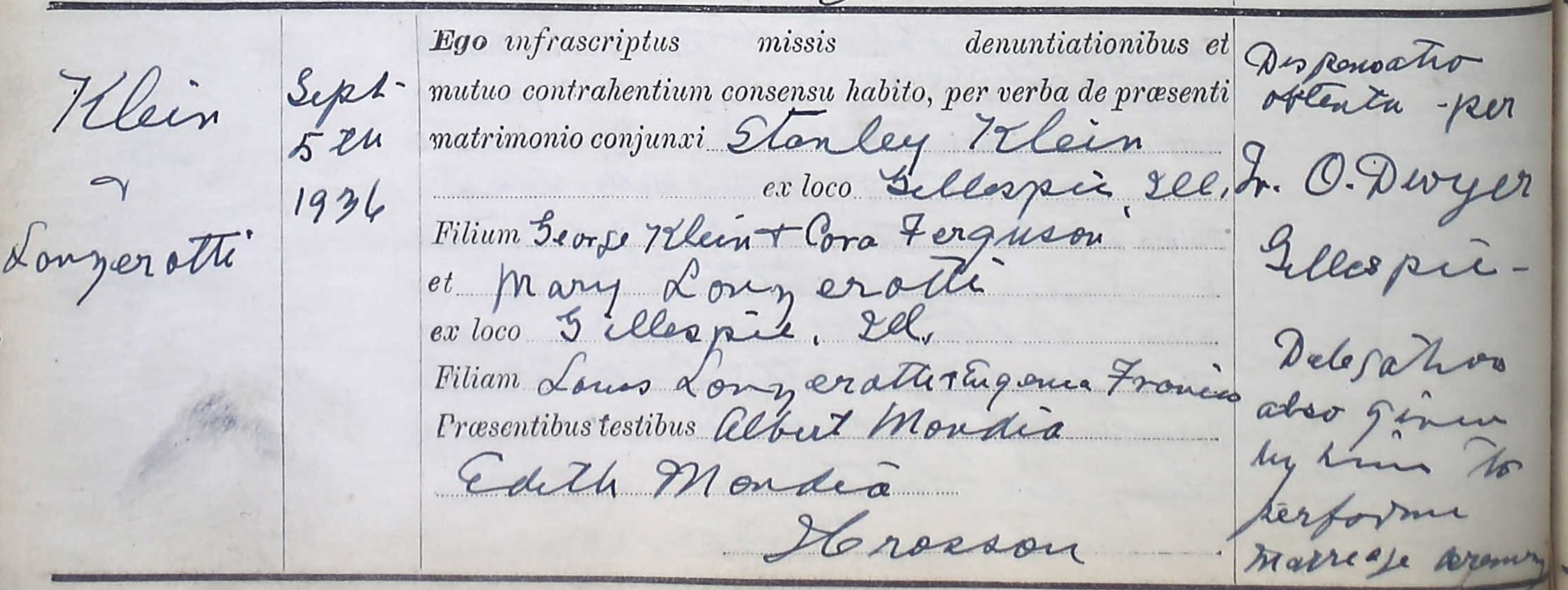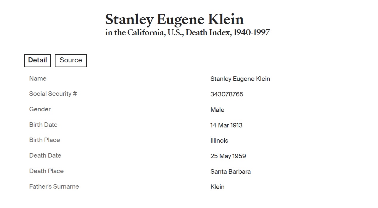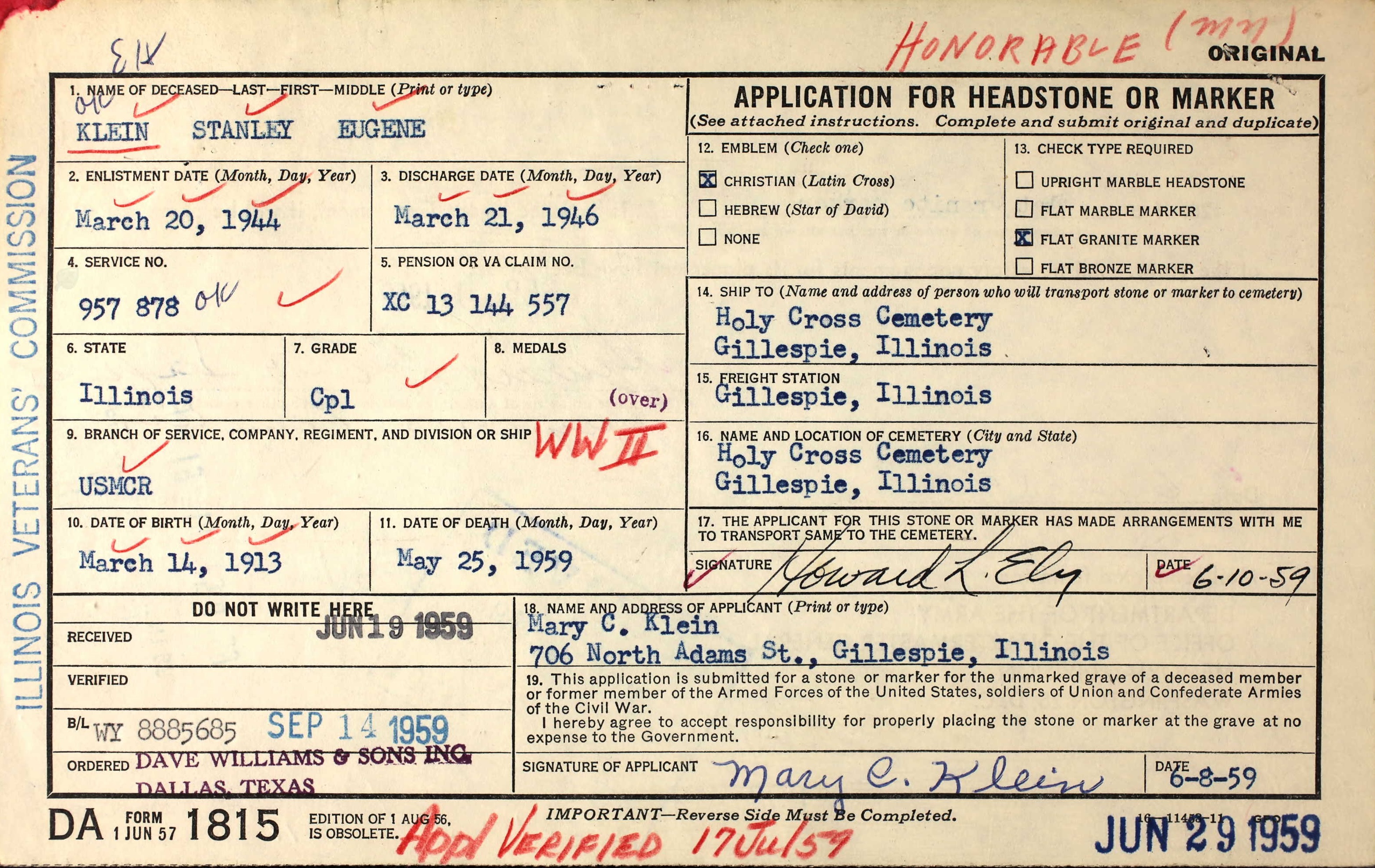 Stanley Eugene Klein was born on March 14, 1913 in Gillespie, Macoupin, Illinois, USA. He and