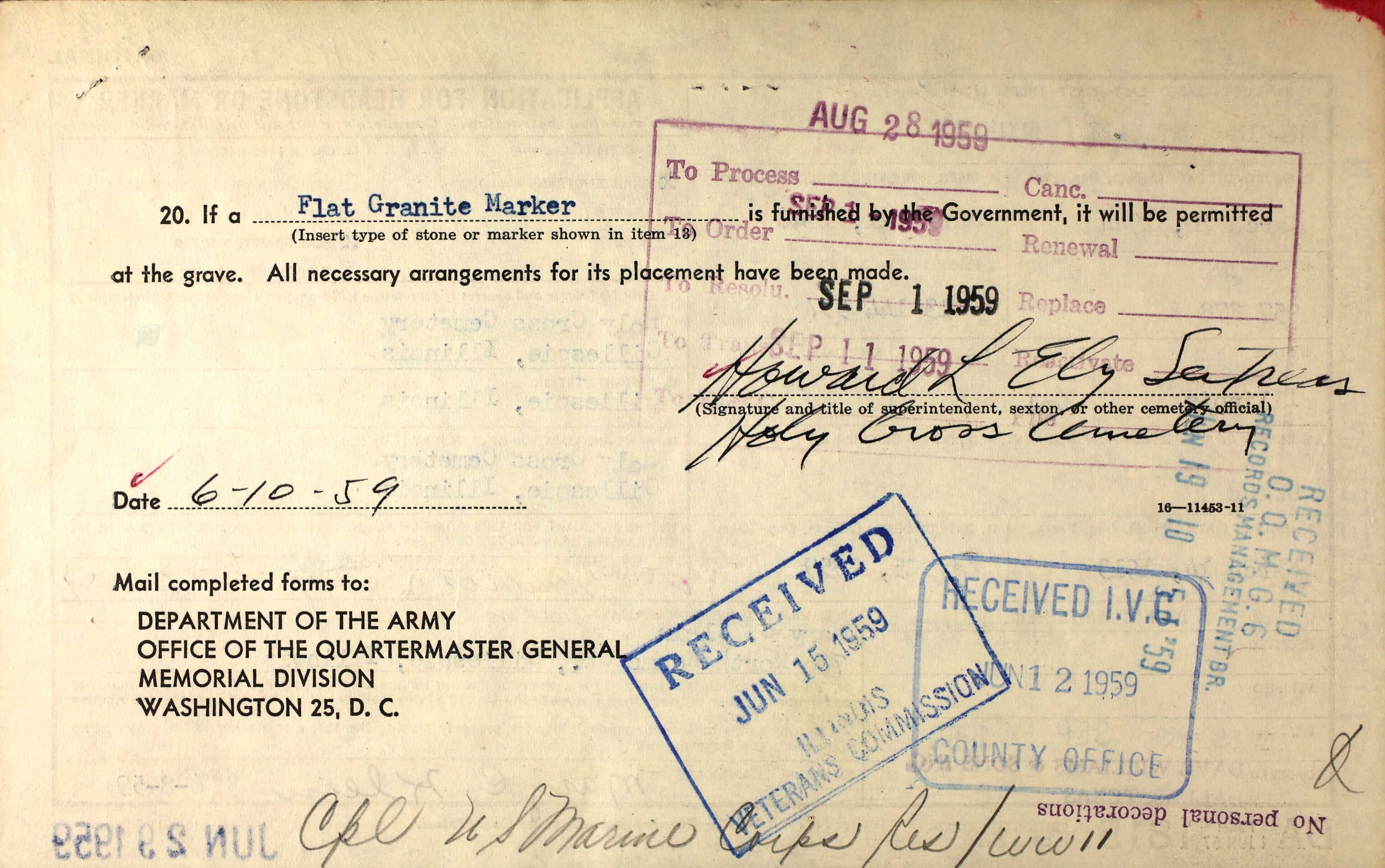 Mary Carolyn Lanzerotti were married on September 5, 1936 in Alton, Madison, Illinois, USA. He died on May 25, 1959, at age 46, in Santa Barbara, California, USA. He was buried in Holy Cross Cemetery, Gillespie, Illinois.