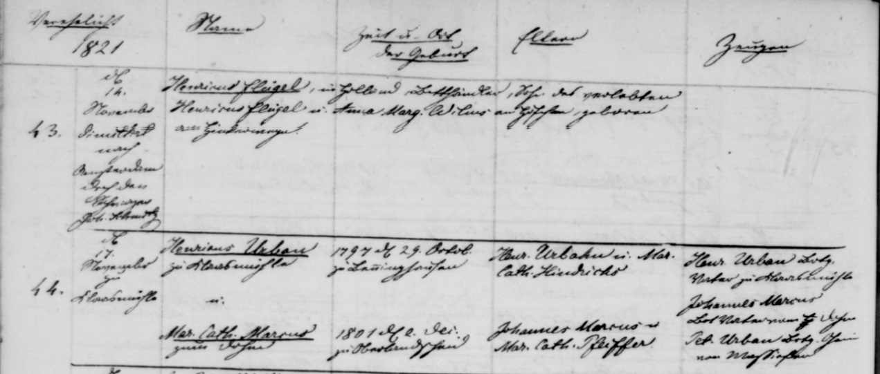 Henrichs Urbahn was born on October 29, 1797 in Benninghausen, Lippstadt, Kreis Soest, North Rhine-Westphalia, Germany. He and