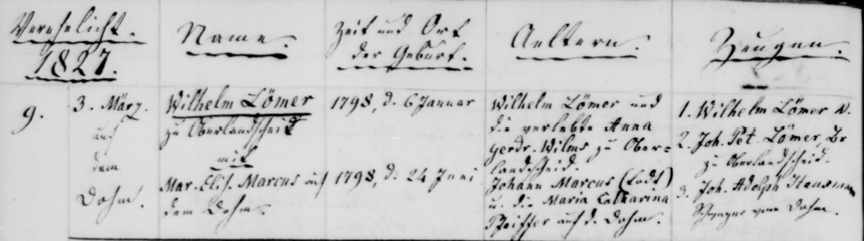 Maria Elisabeth Marcus were married on March 3, 1827 in Dohm, Burscheid, Rheinsch-Bergisch, North Rhine-Westphalia, Germany. He died.