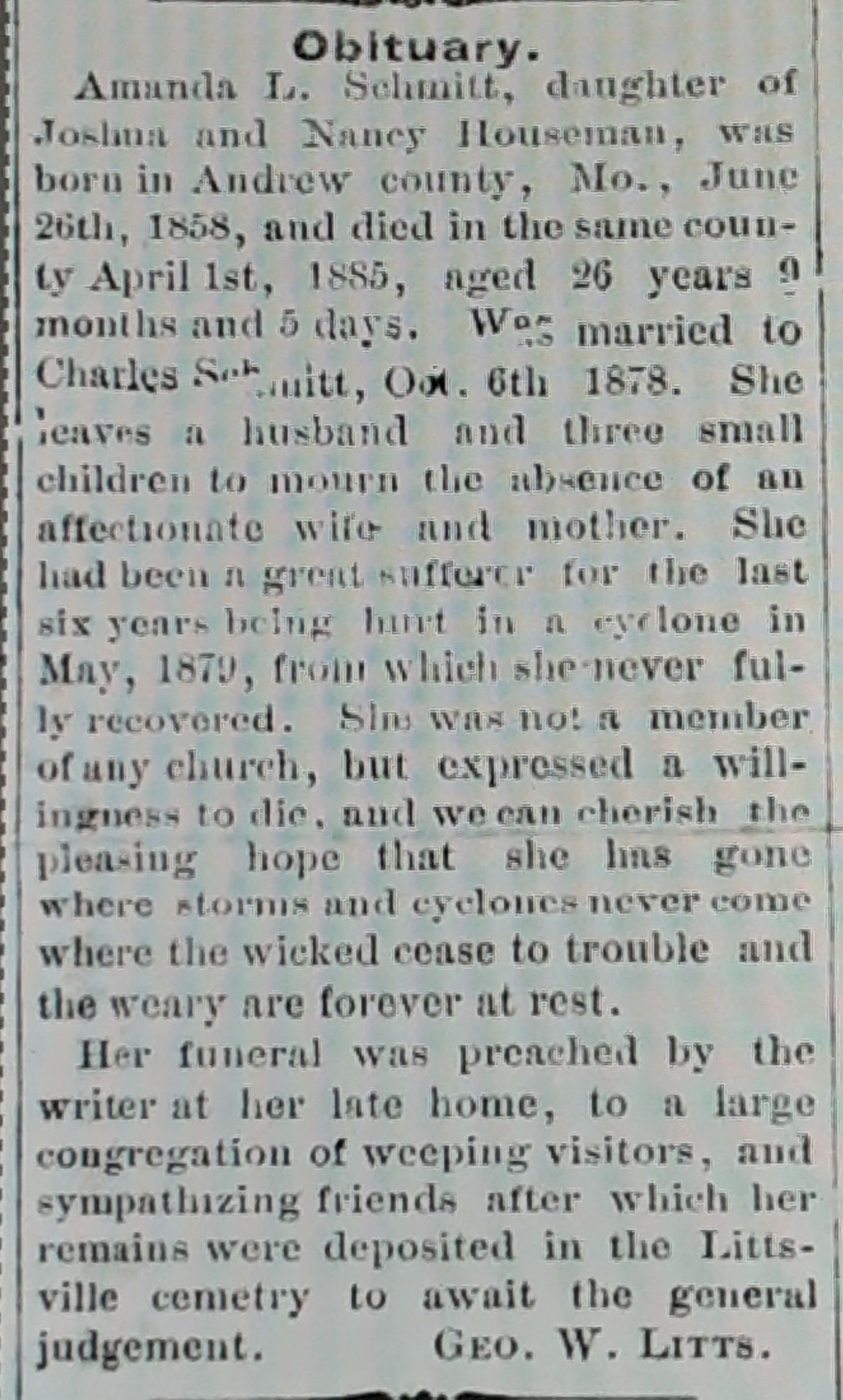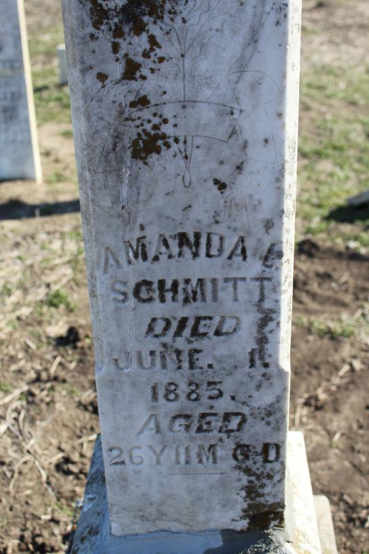 Charles Jacob Schmitt were married on October 6, 1878. She died on April 1, 1885, at age 26, in Andrew, Missouri, USA. She was buried in Litts Cemetery, Whitecloud, Missouri.