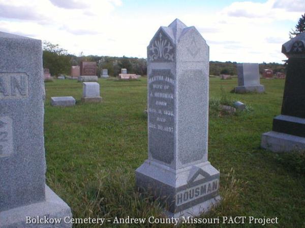 Josua Hausman were married in 1860. She died on December 30, 1897, at age 61. She was buried in Bolckow Cemetery, Bolckow, Missouri.