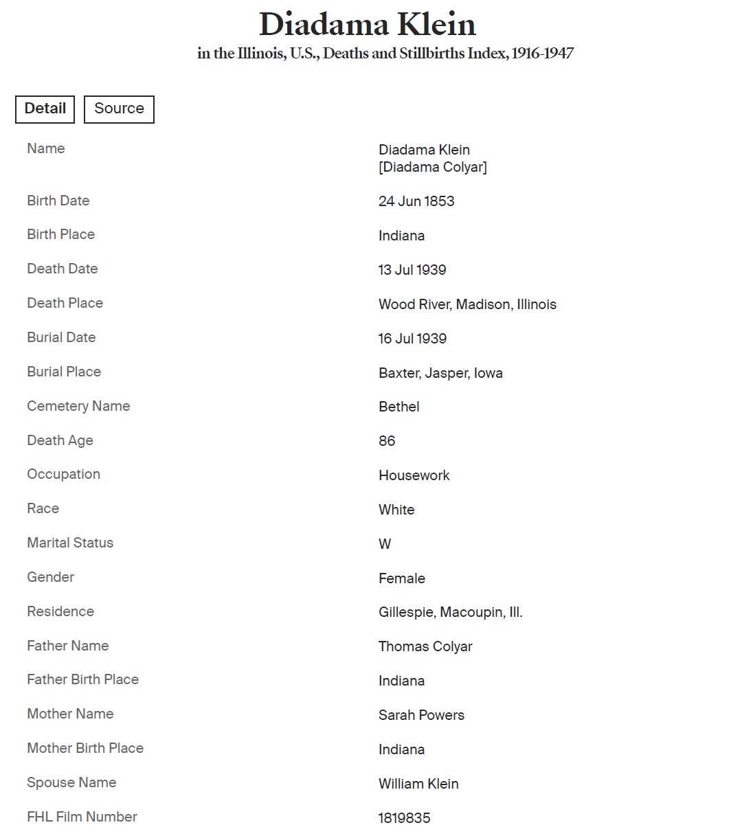 Georg Philipp William Klein were married in 1871. She died on July 13, 1939, at age 86, in Wood River, Madison, Illinois, USA.