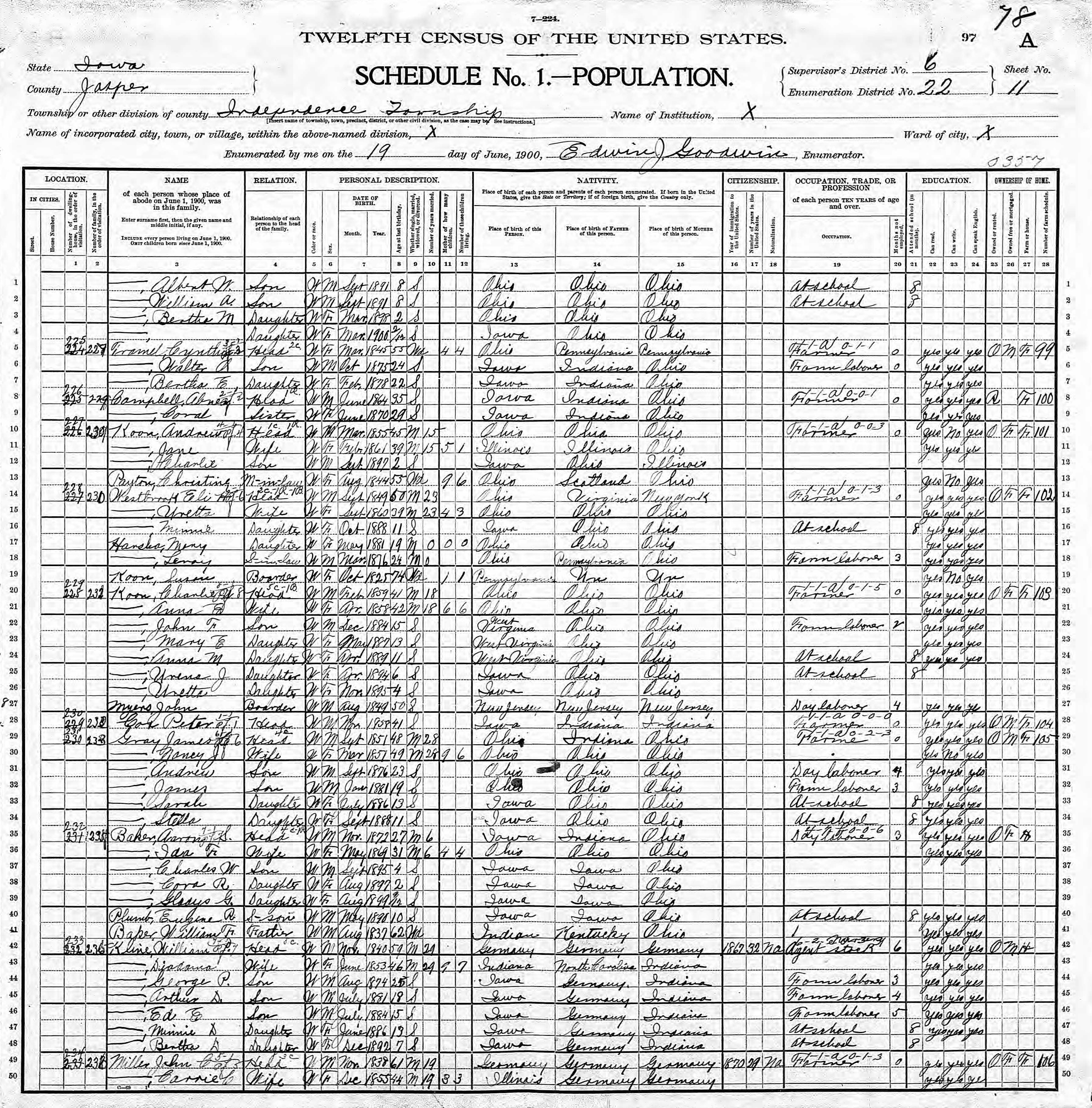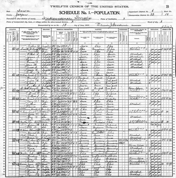 Klein Family 1900 Federal Census Iowa, Lines 42-48