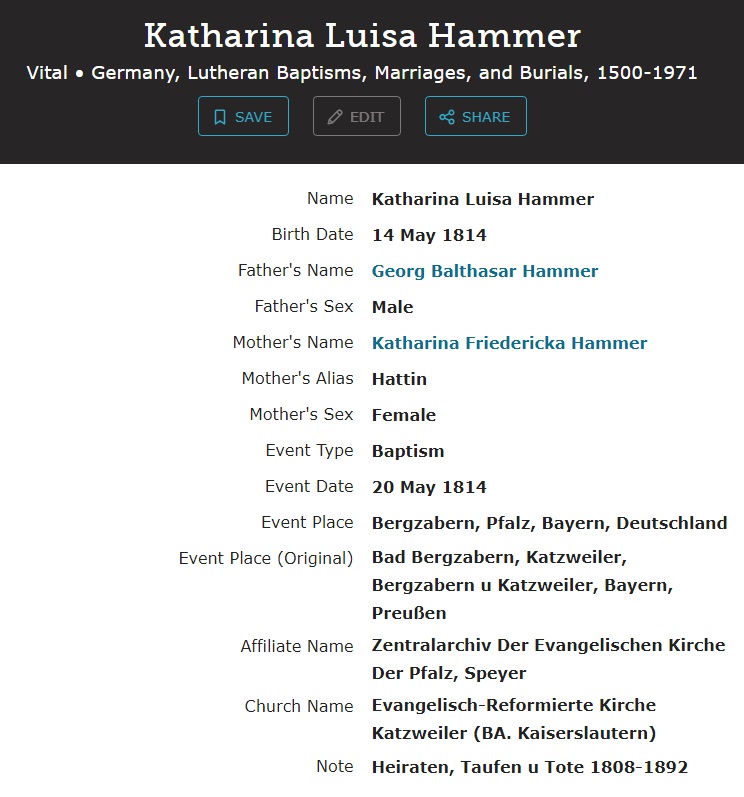 Katharine Luisa Hammer was born on May 11, 1814 in Bad Bergzabern, Südliche Weinstraße, Rhineland-Palatinate, Germany. She and