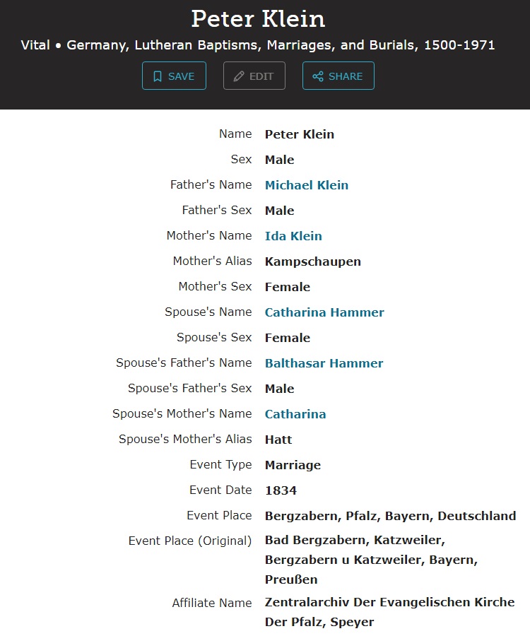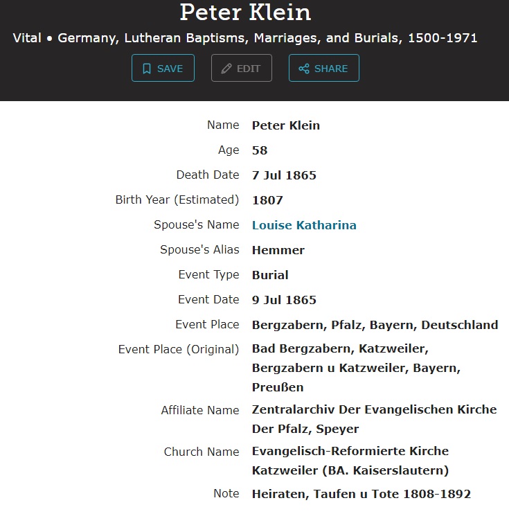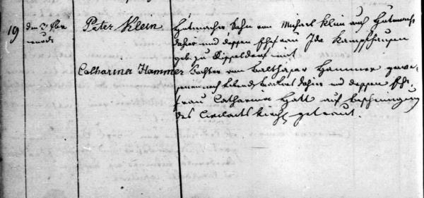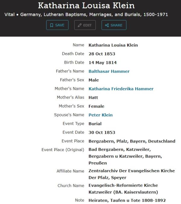 Peter Klein were married on December 3, 1834 in Bad Bergzabern, Südliche Weinstraße, Rhineland-Palatinate, Germany. She died on October 28, 1853, at age 39, in Bad Bergzabern, Südliche Weinstraße, Rhineland-Palatinate, Germany.
