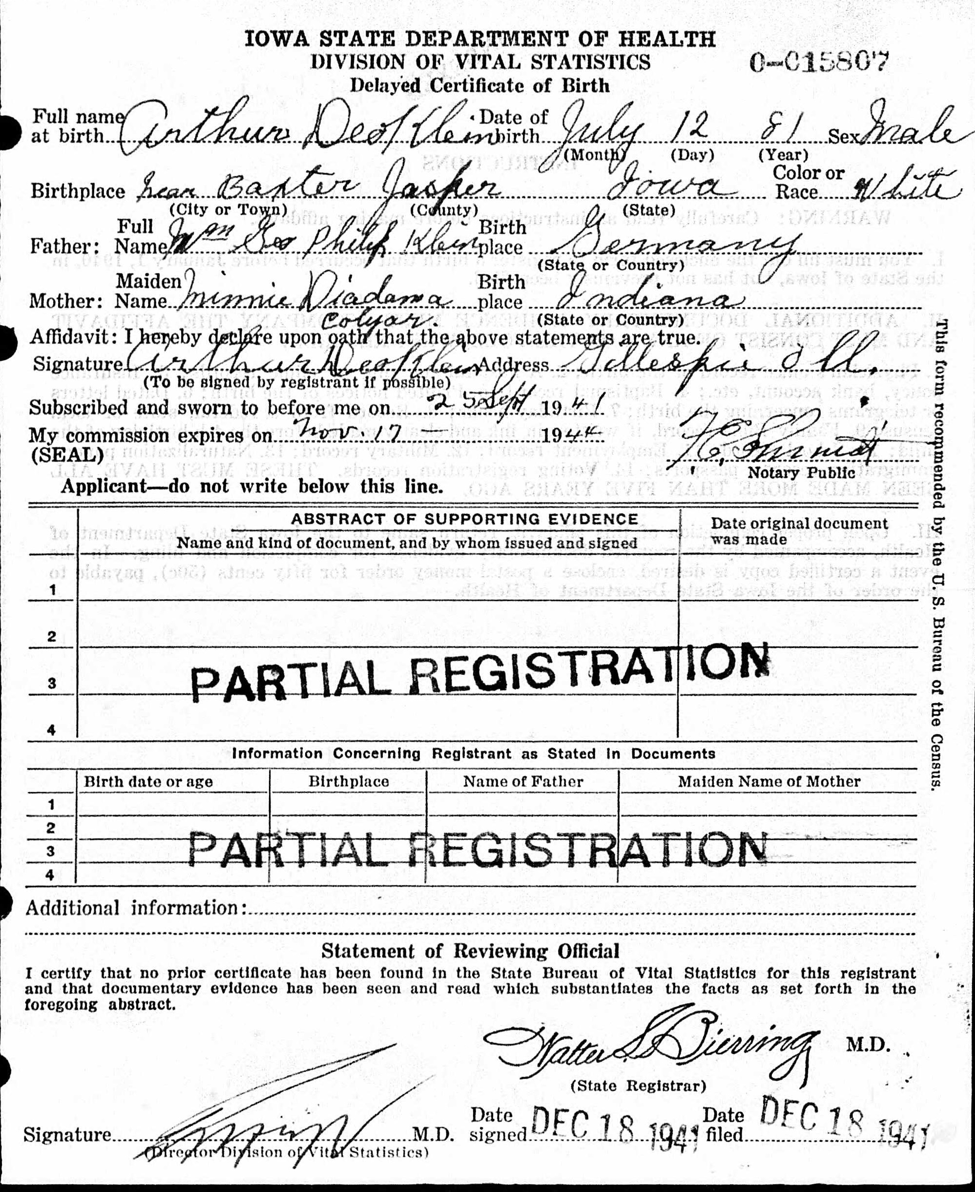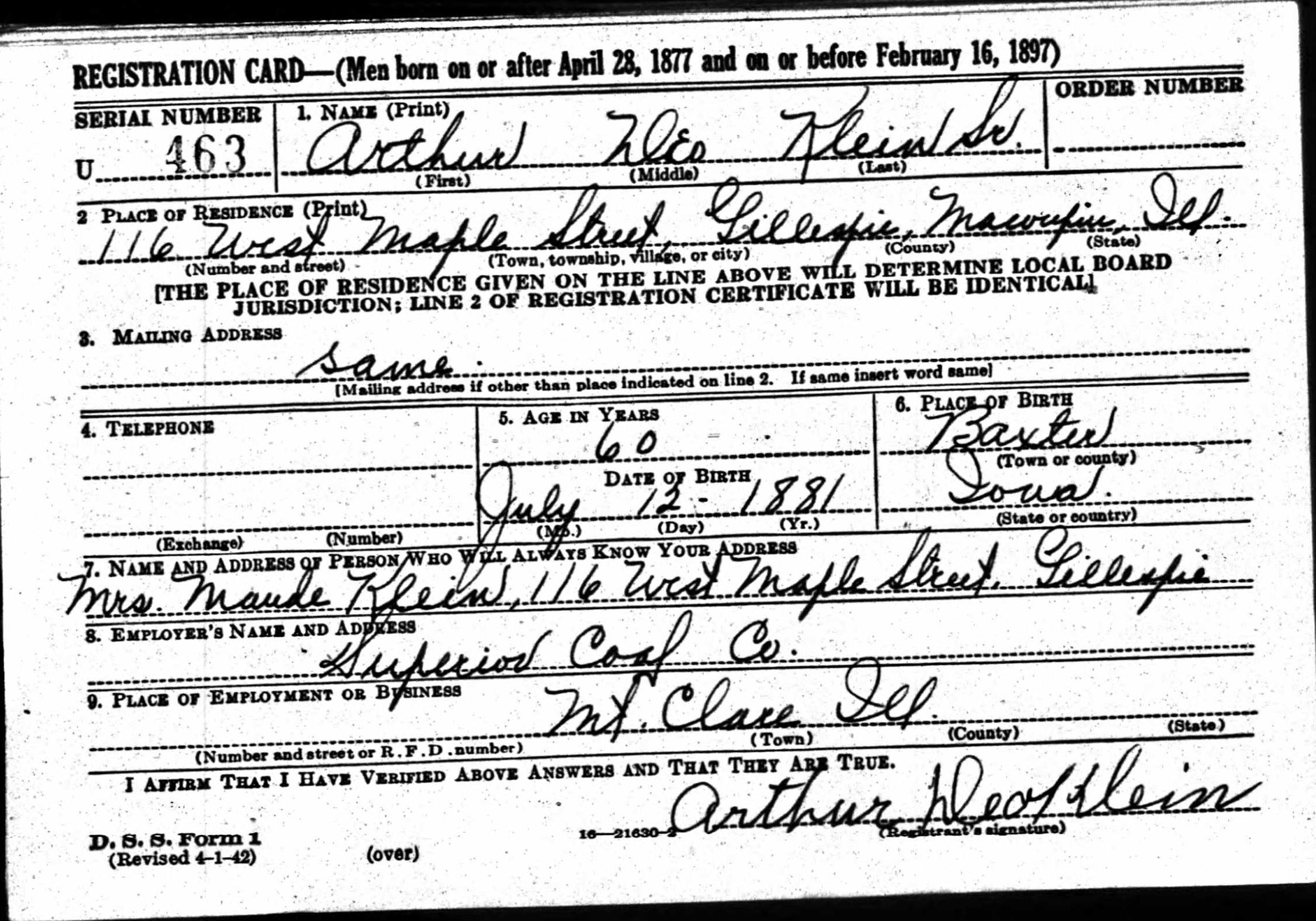 Arthur Deo Klein, Sr., was born on July 12, 1881 in Baxter, Jasper, Iowa, USA. He and