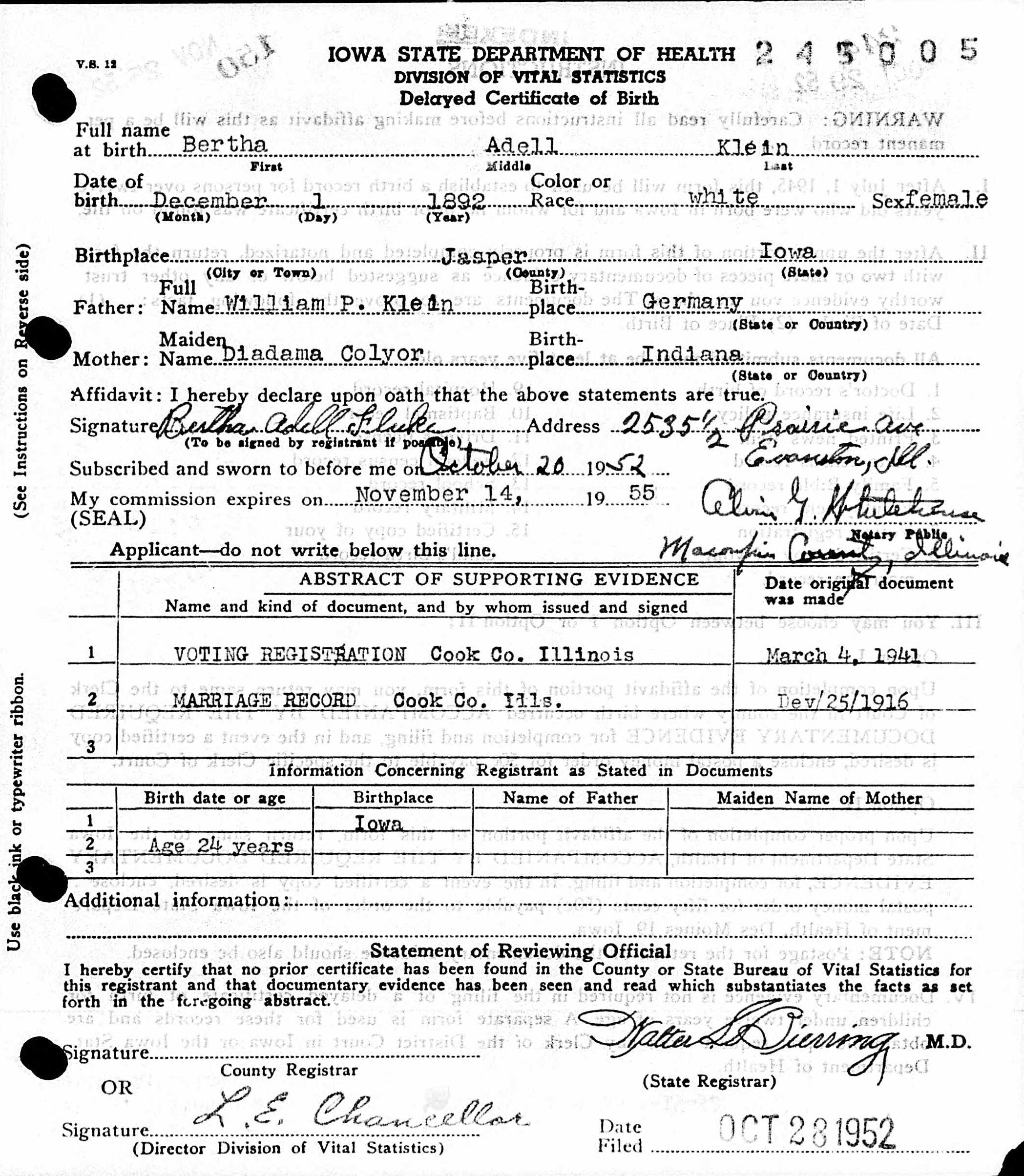 Bertha Adell Klein was born on December 1, 1892 in Jasper, Iowa, USA. She and