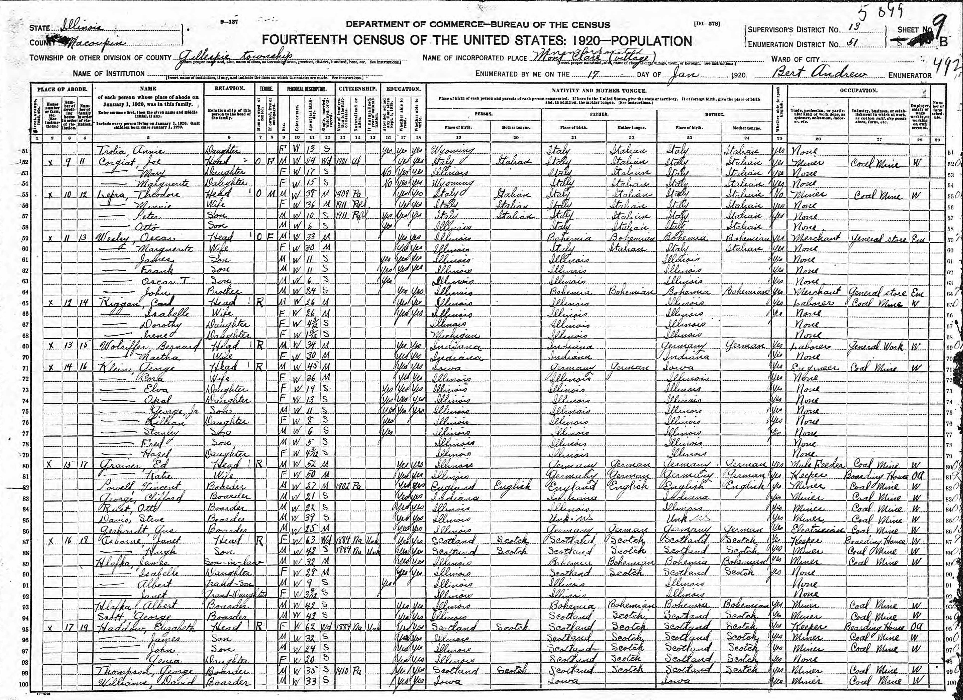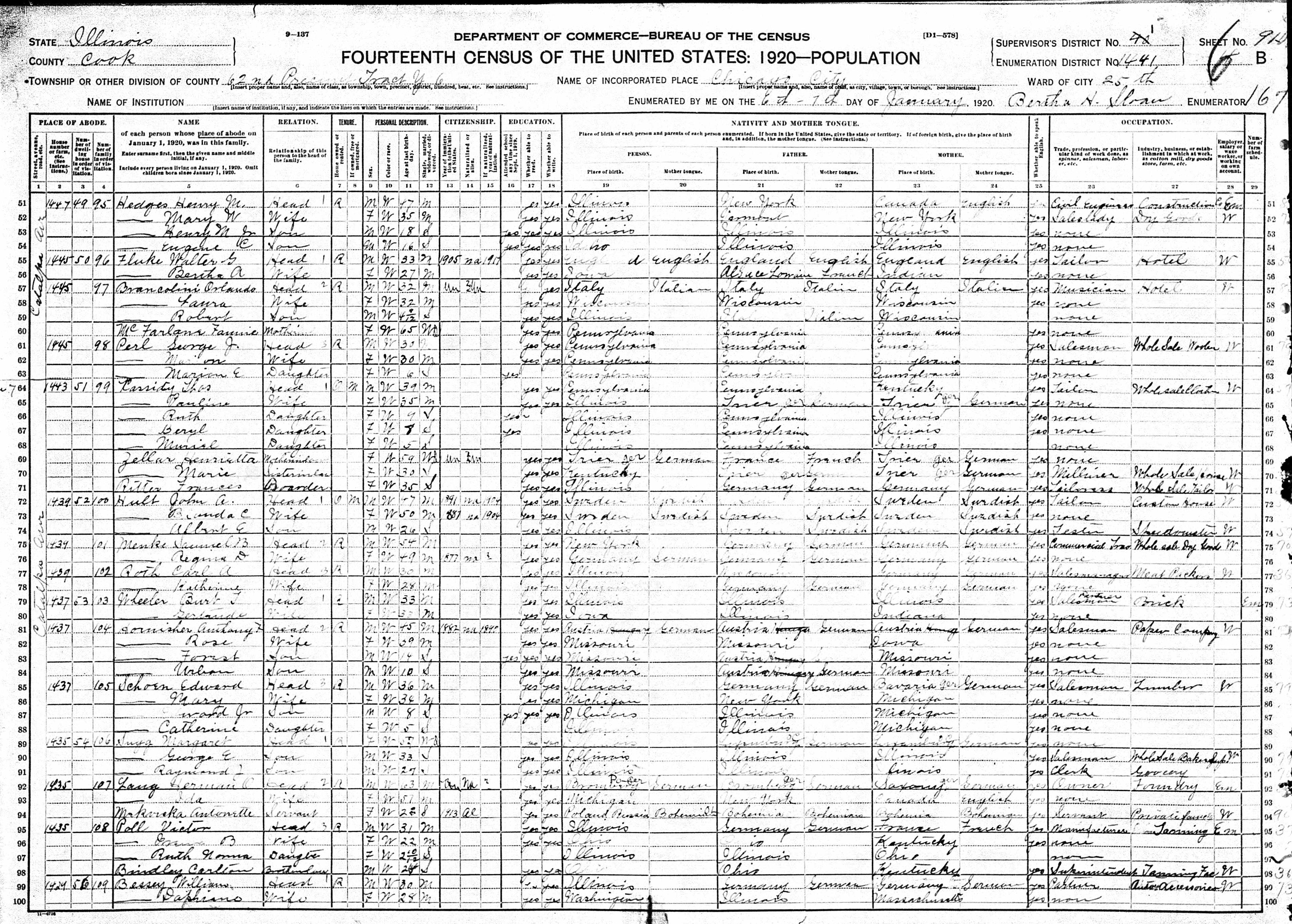 Klein Family 1920 Federal Census Illinois, Lines 71-79