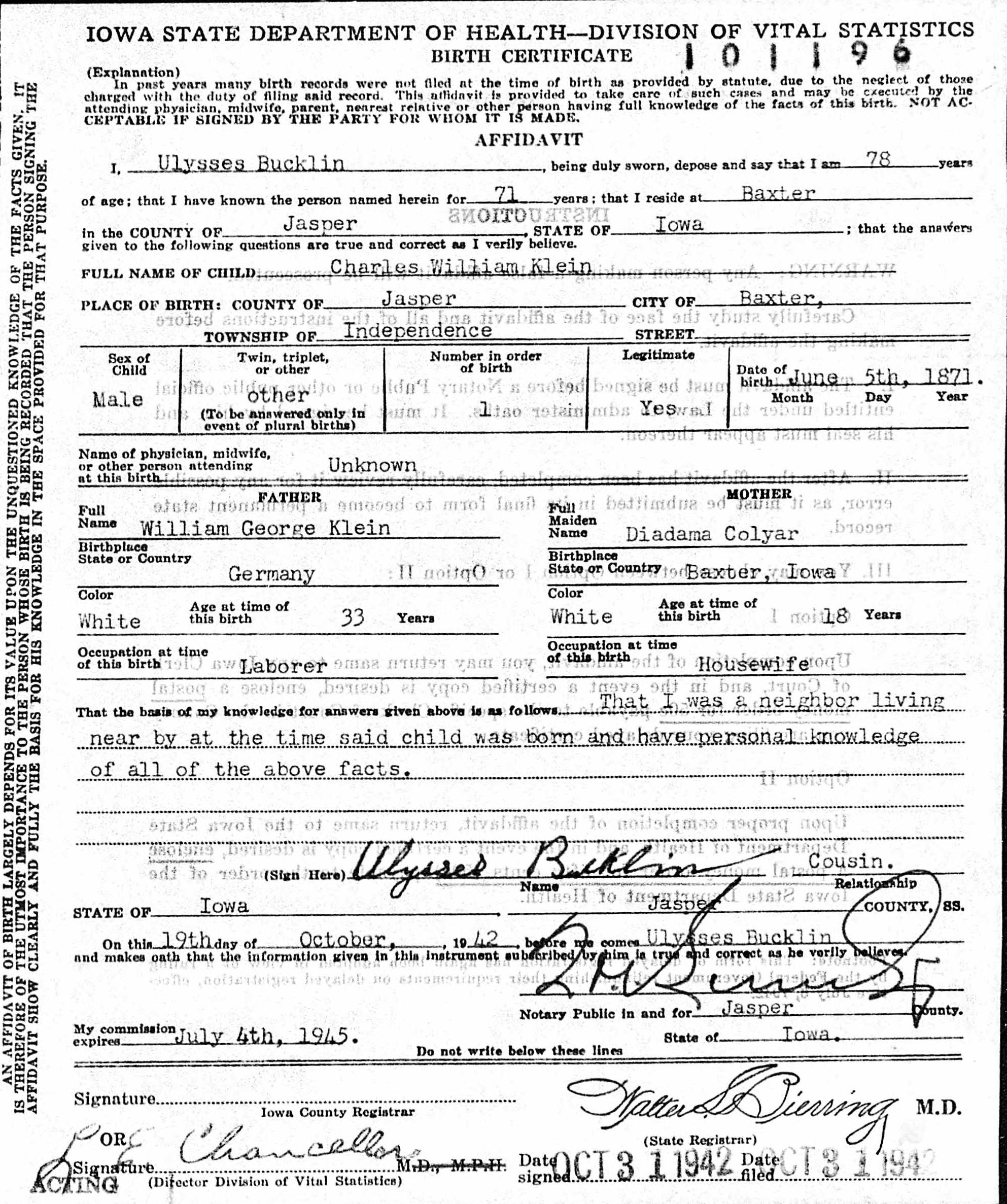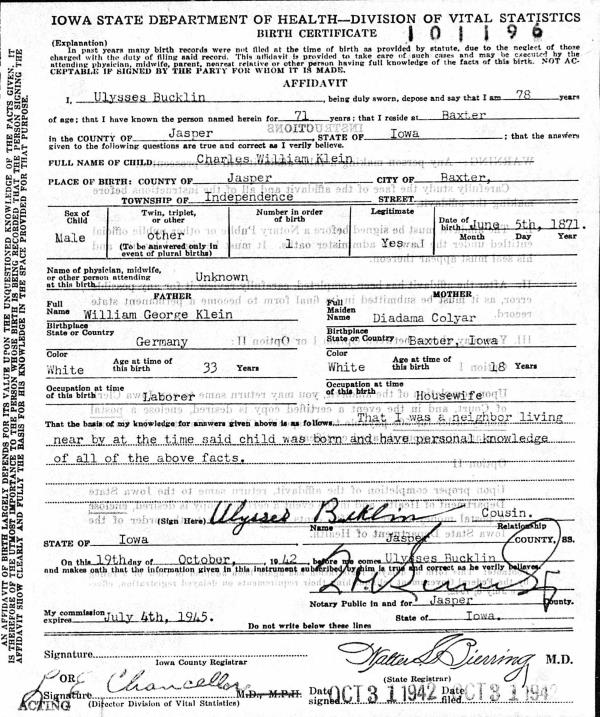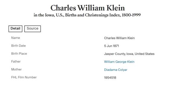 Charles William Klein was born on June 5, 1871 in Baxter, Jasper, Iowa, USA. He and