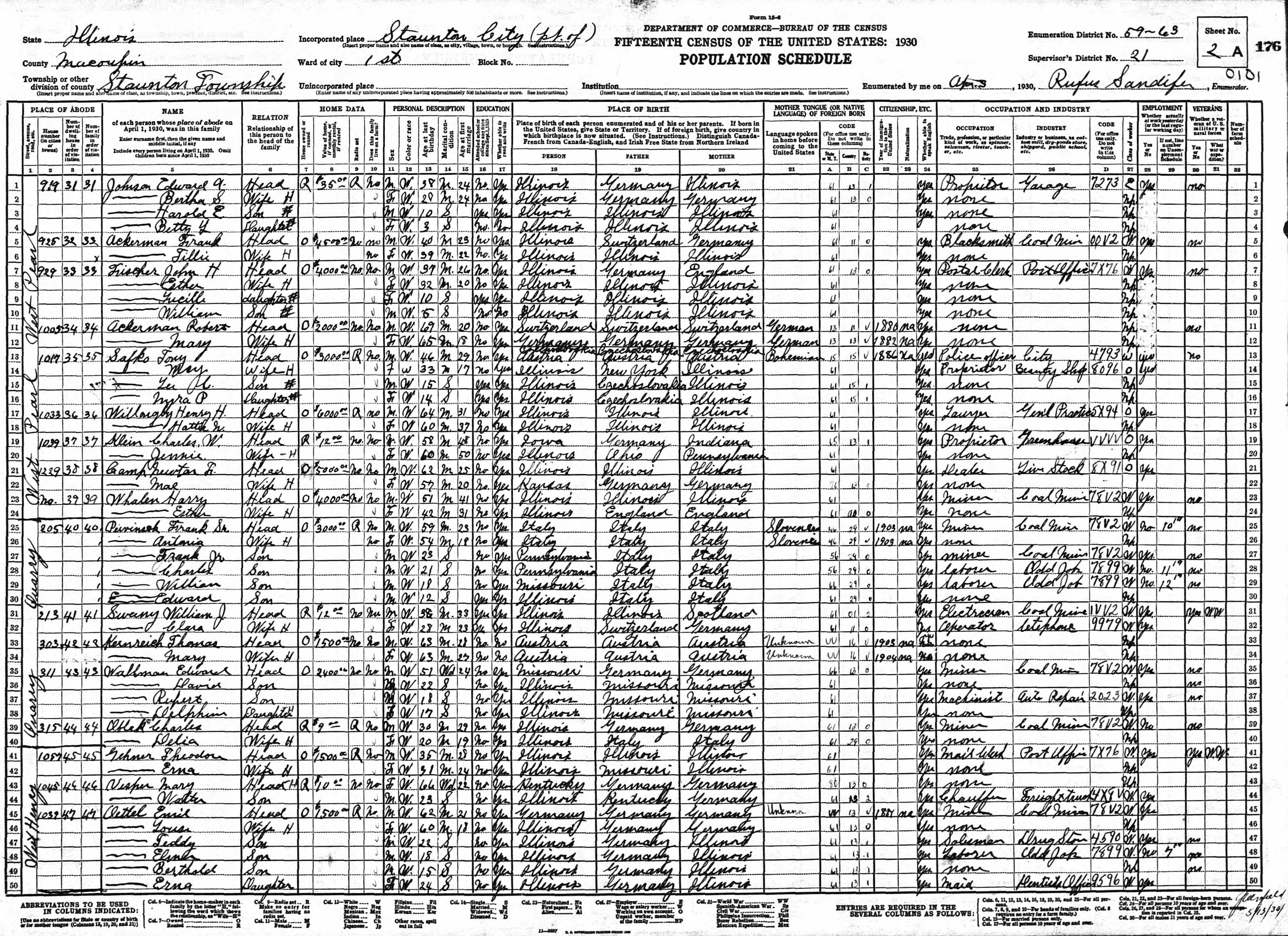 Klein Family 1930 Federal Census Illinois, Lines 61-65