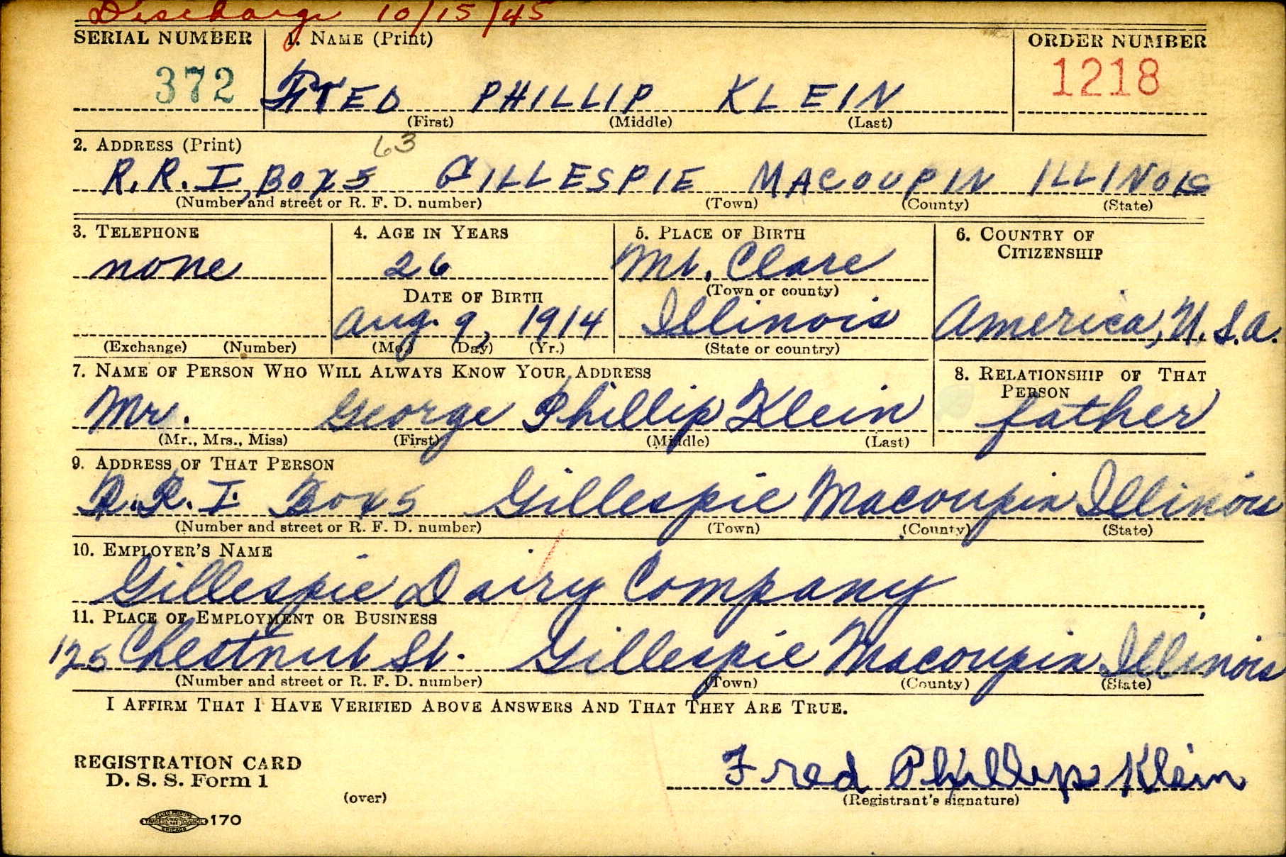 Fred Philip Klein was born on August 9, 1914 in Mount Clare, Macoupin, Illinois, USA. He died.