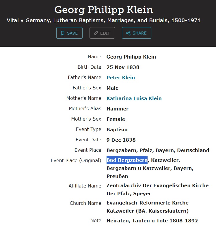 Georg Philipp William Klein was born on November 25, 1838 in Bad Bergzabern, Südliche Weinstraße, Rhineland-Palatinate, Germany. He and
