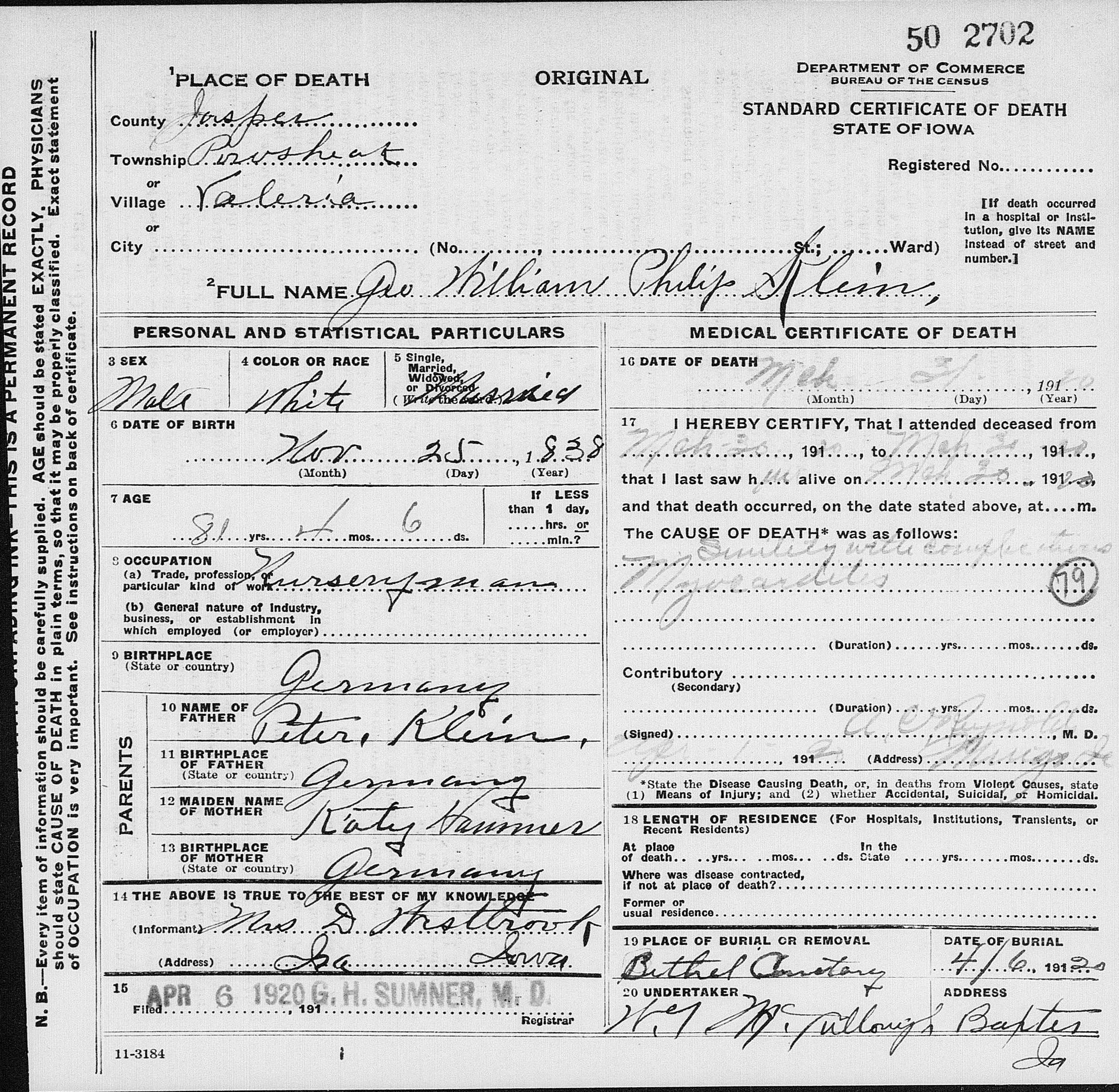 1920 Death Record