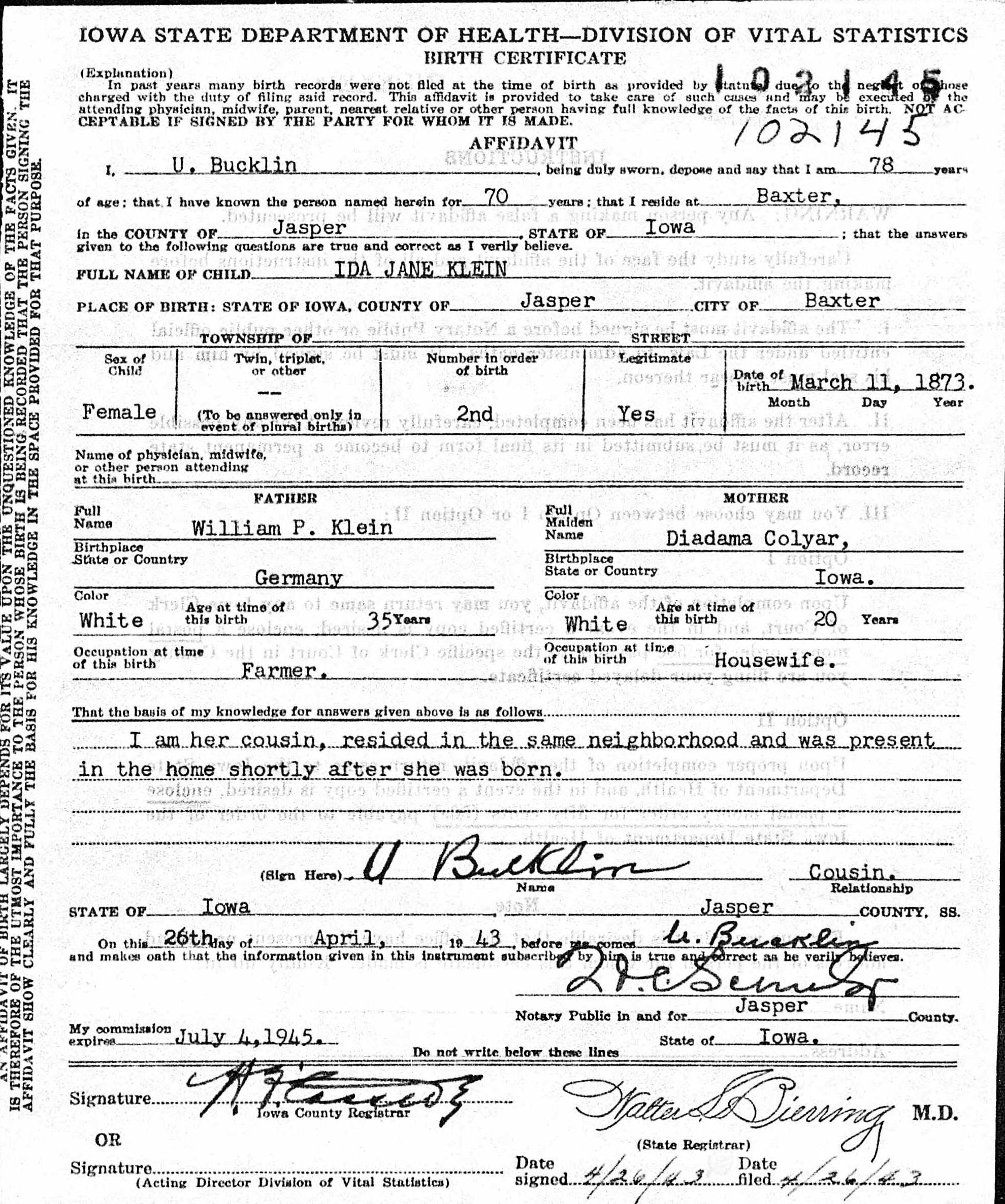 Ida Jane Klein was born on March 11, 1873 in Baxter, Jasper, Iowa, USA. She and