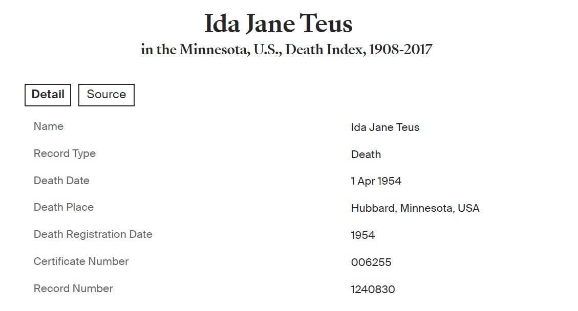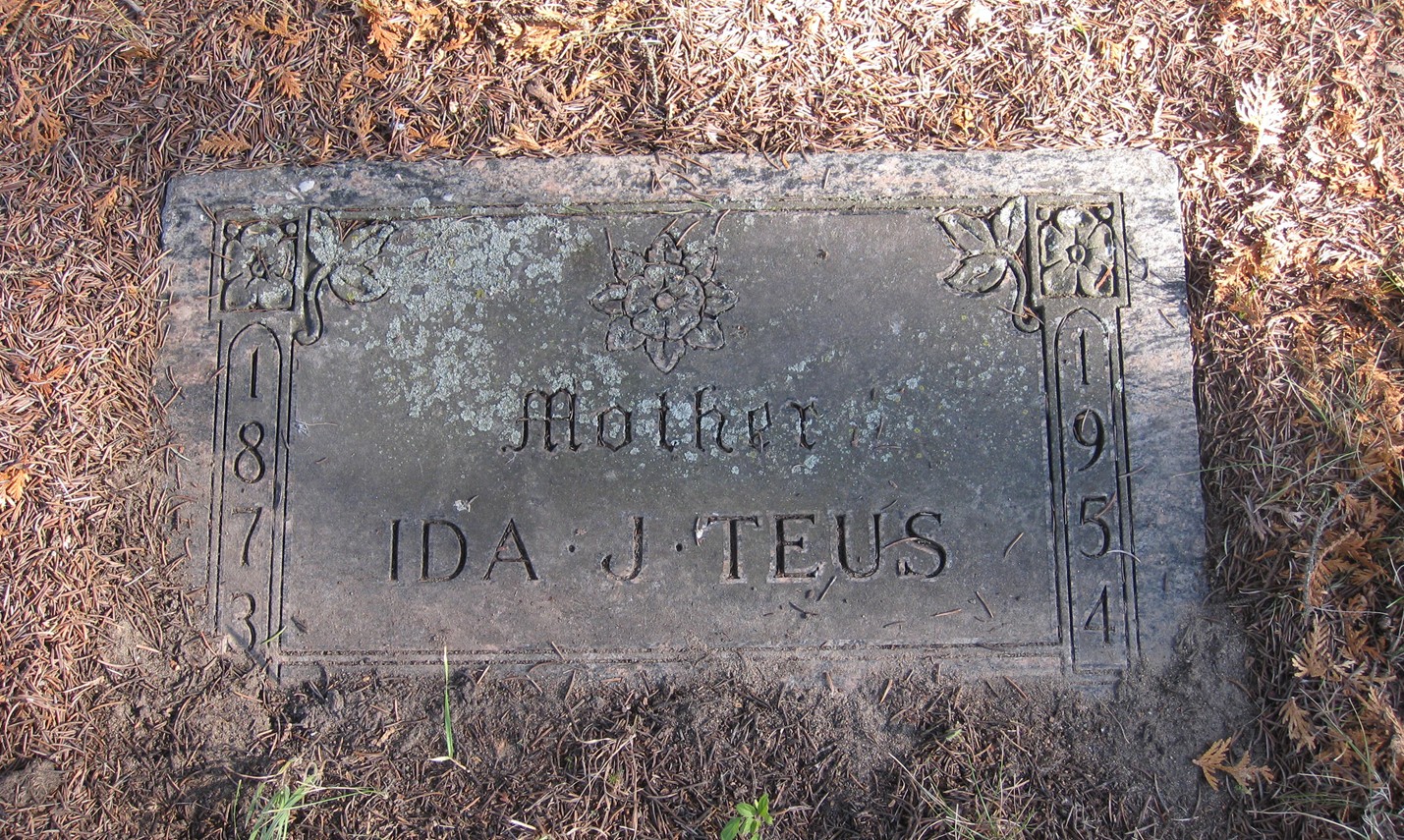 Frank O. Teus were married on May 4, 1892 in Jasper, Iowa, USA. She died on April 1, 1954, at age 81, in Hubbard, Minnesota, USA. She was buried in Greenwood Cemetery, Park Rapids, Minnesota.
