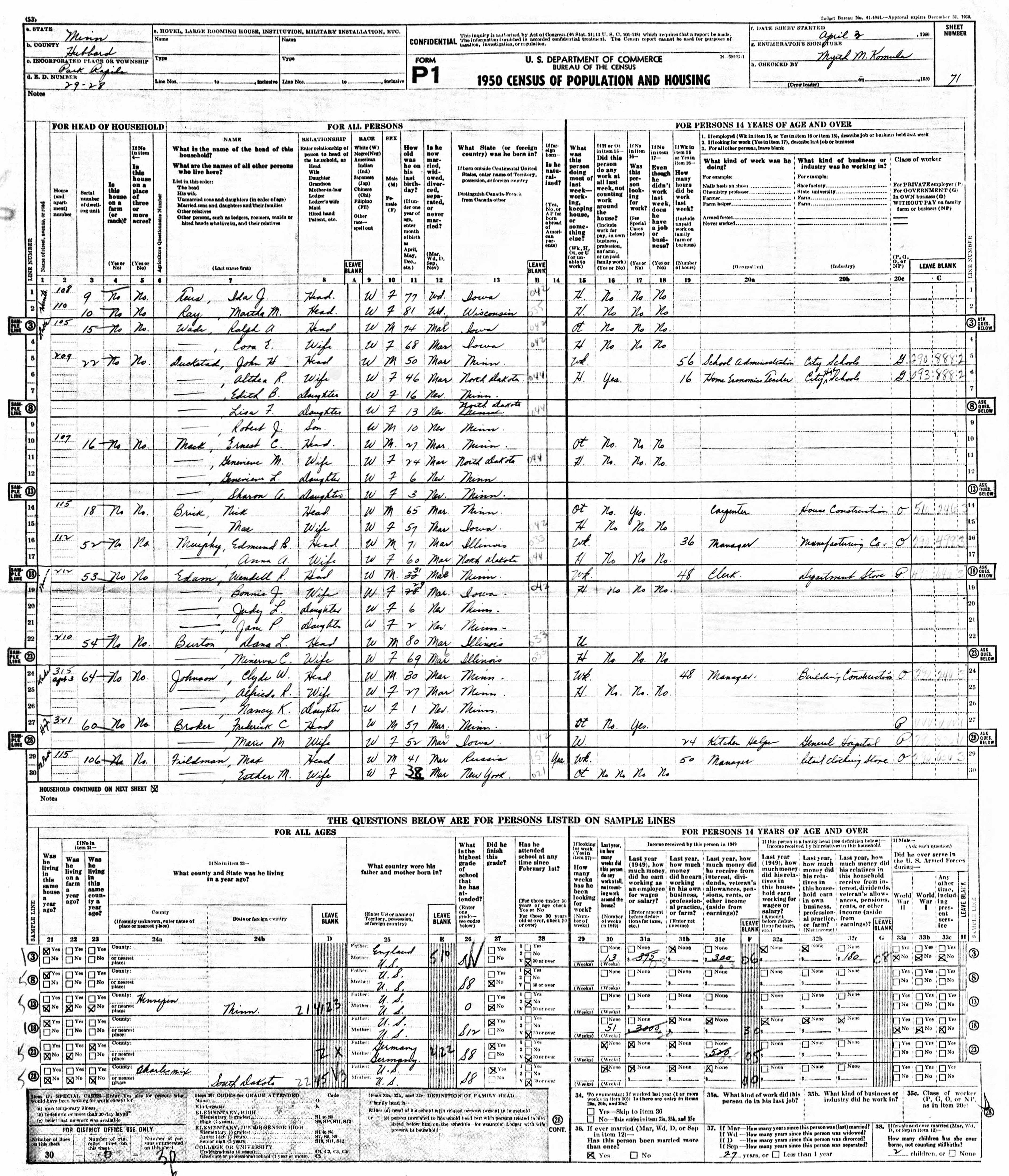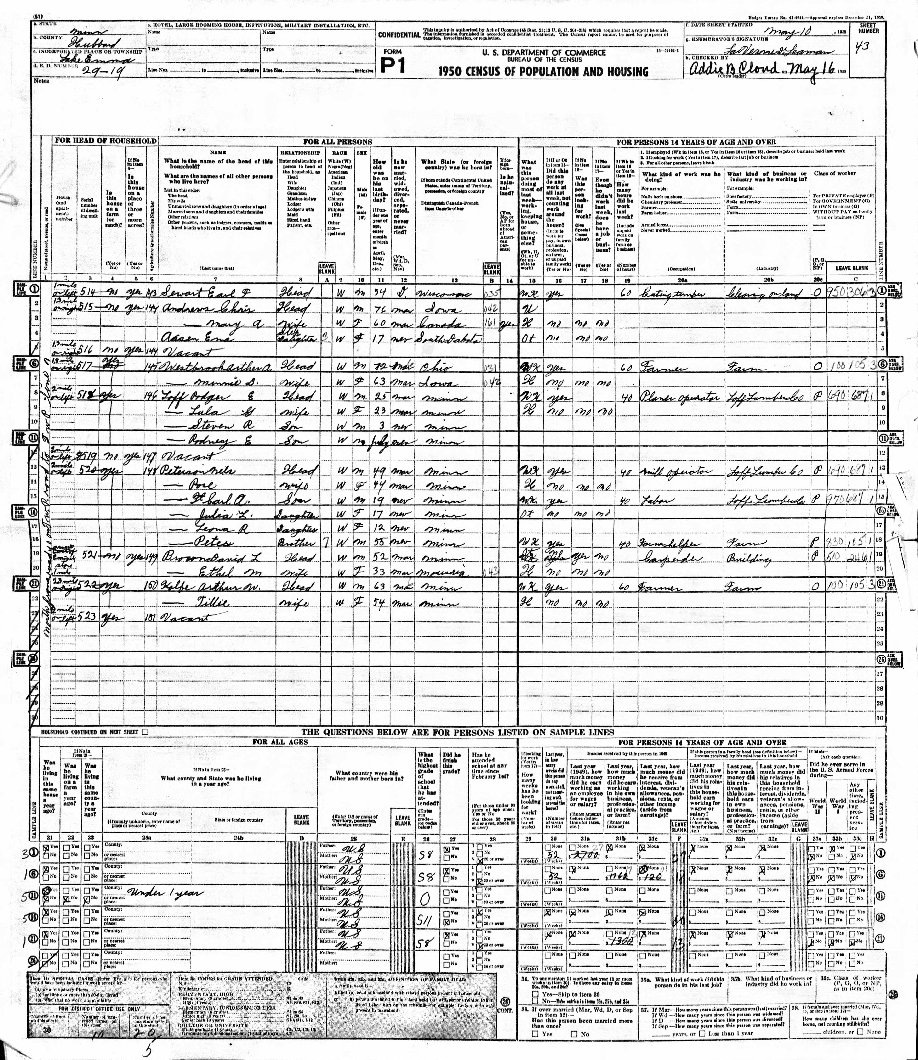 Westbrook Family 1950 Federal Census Minnesota, Lines 6-7