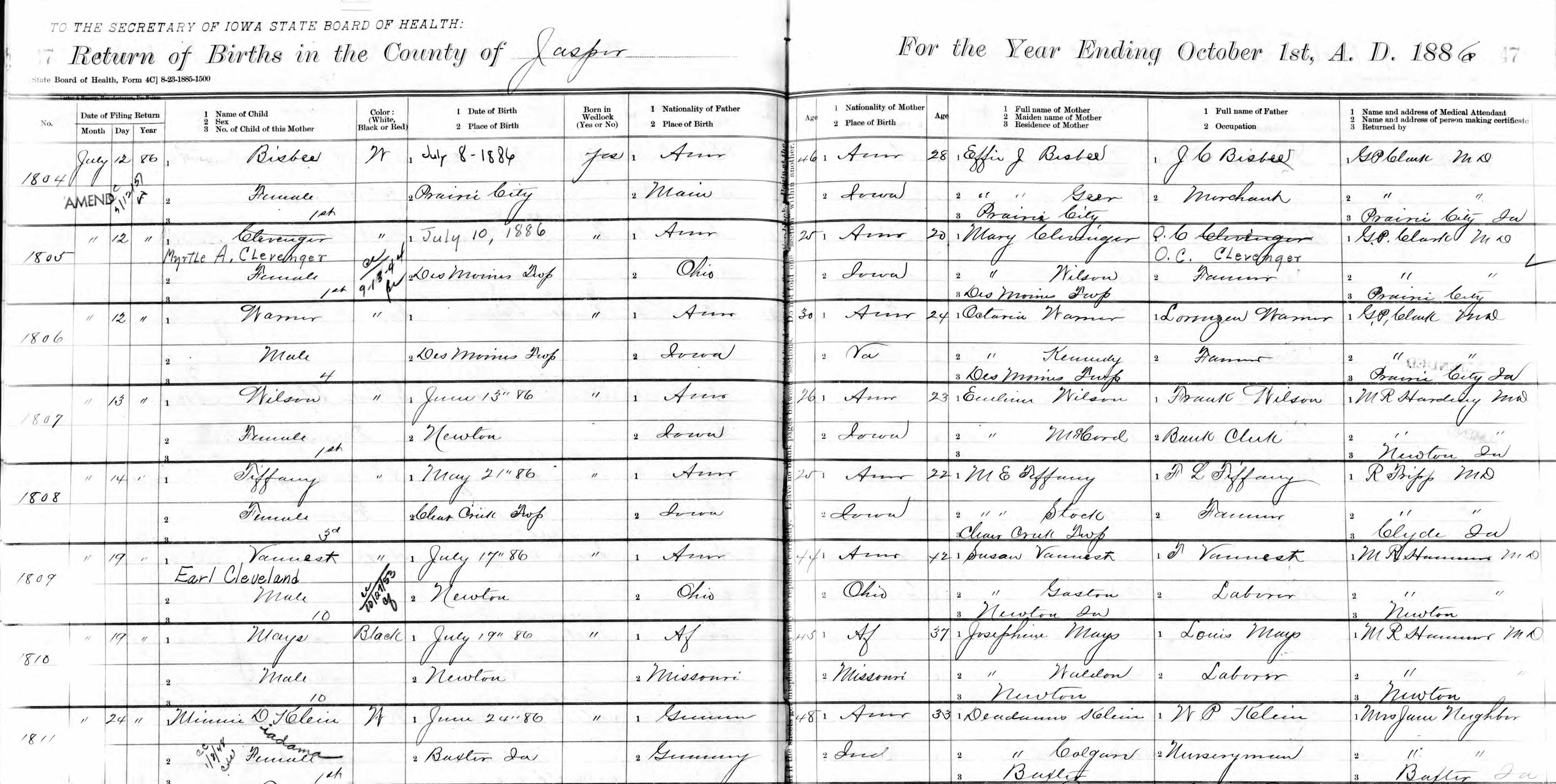 1886 Birth Record, Line 1811
