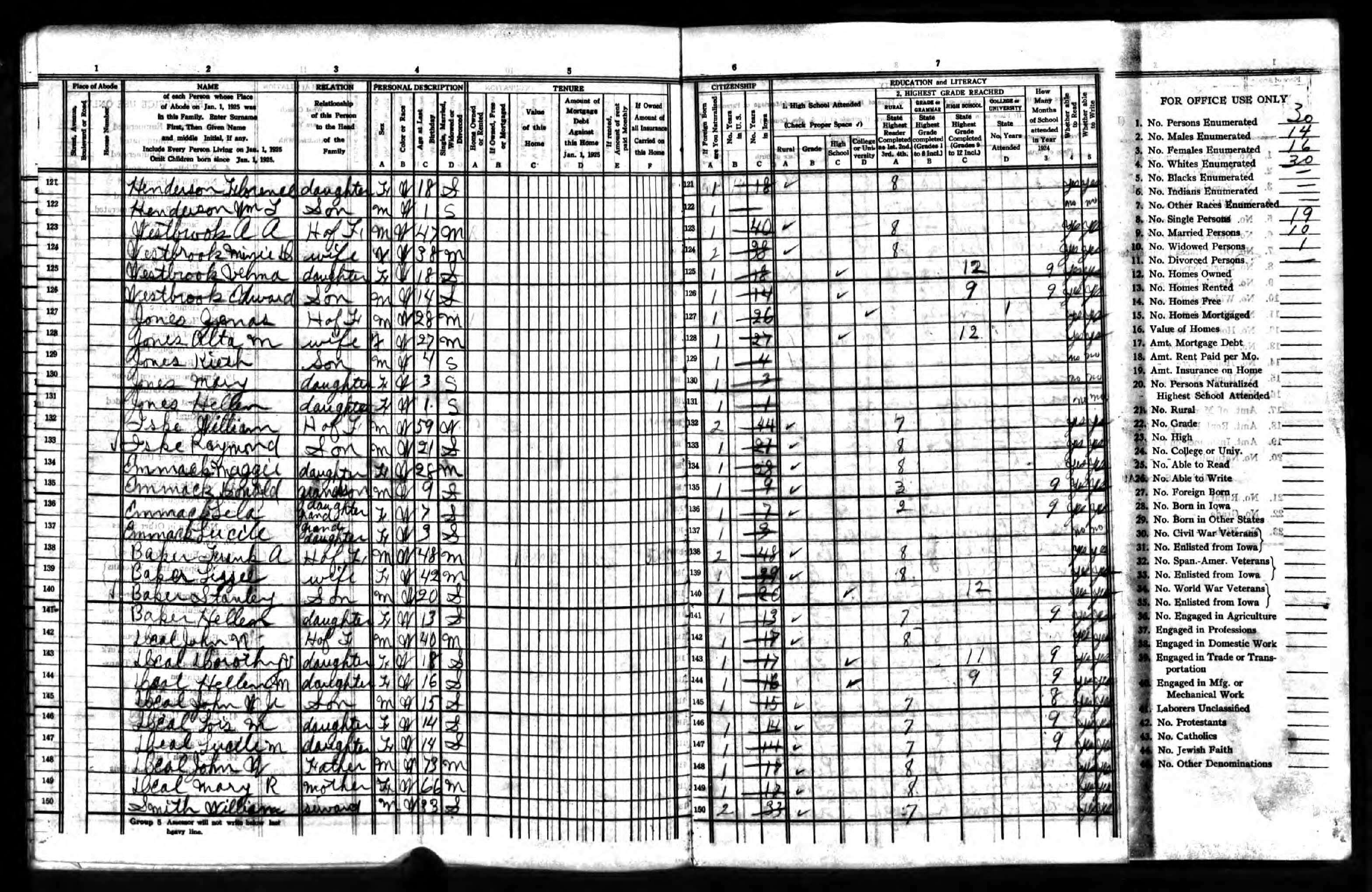 Westbrook Family 1925 State Census Iowa, Lines 123-126
