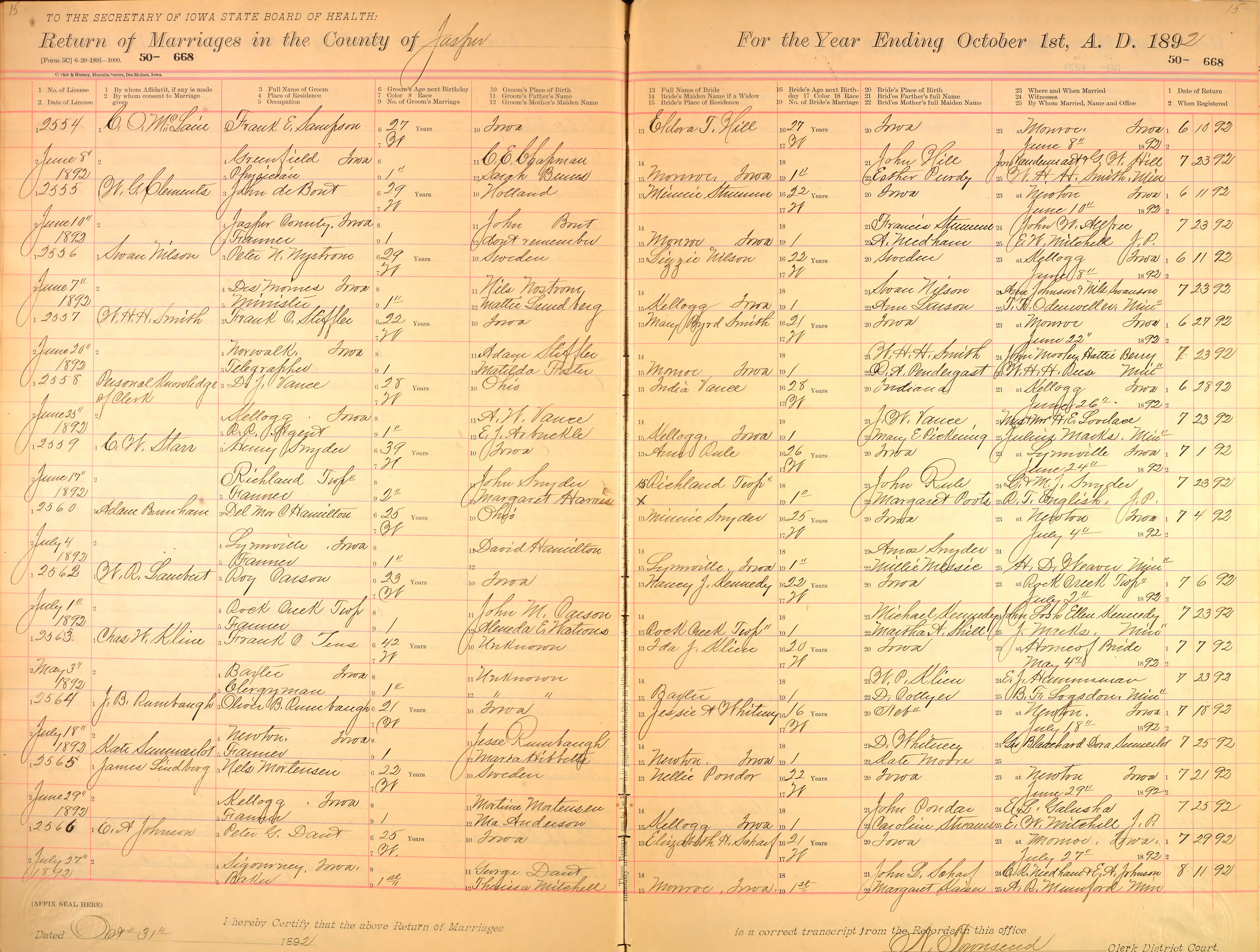 1892 Marriage Record, Line 2563