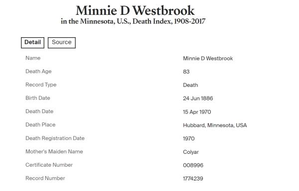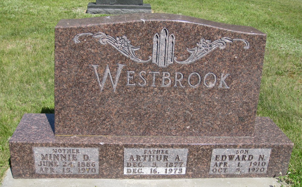 Arthur Arville Westbrook were married on June 1, 1923 in Des Moines, Polk, Iowa, USA. She died on April 15, 1970, at age 83, in Hubbard, Minnesota, USA. She was buried in Lake Emma Cemetery, Emmaville, Minnesota.