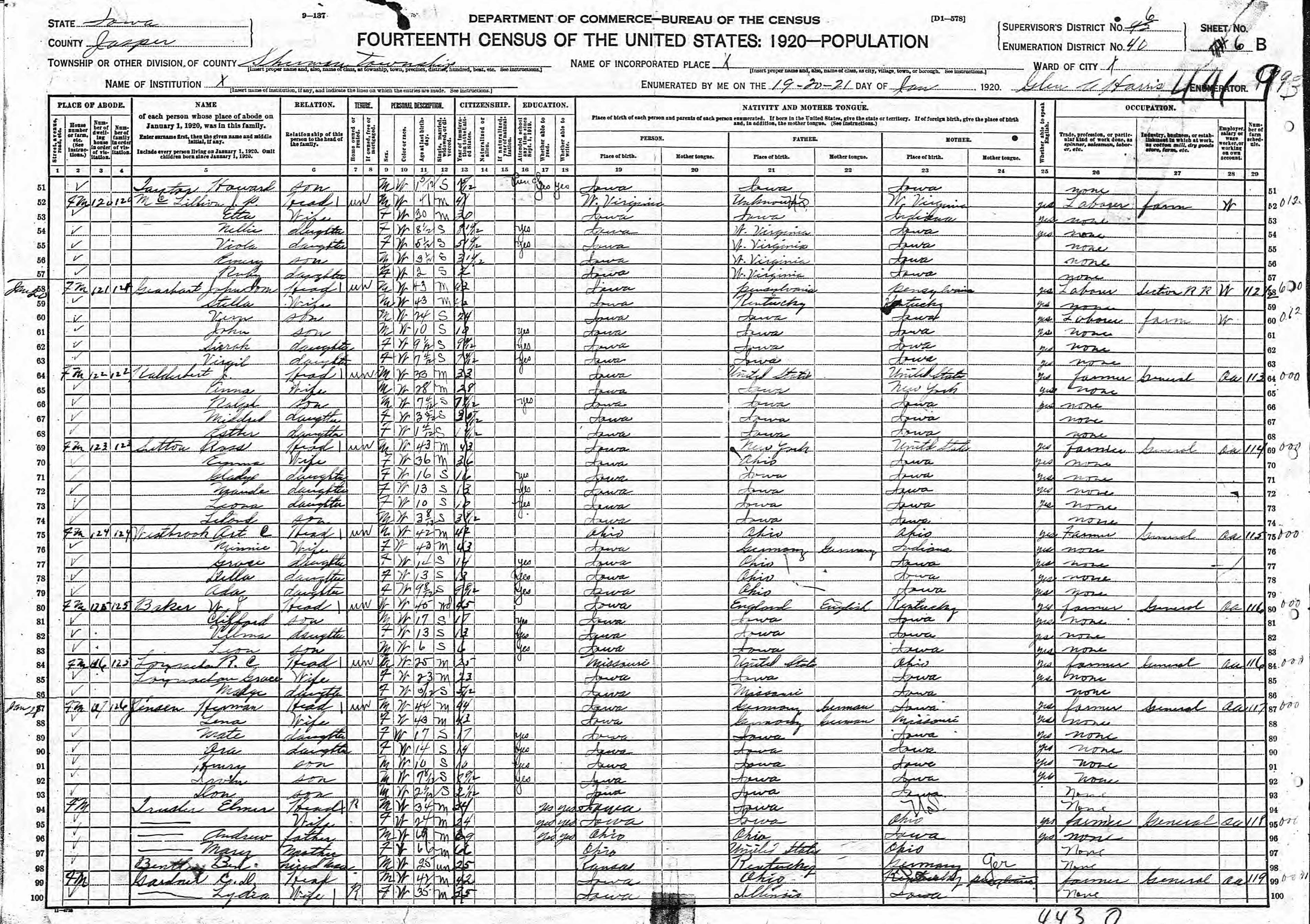Westbrook Family 1920 Federal Census Iowa, Lines 75-79