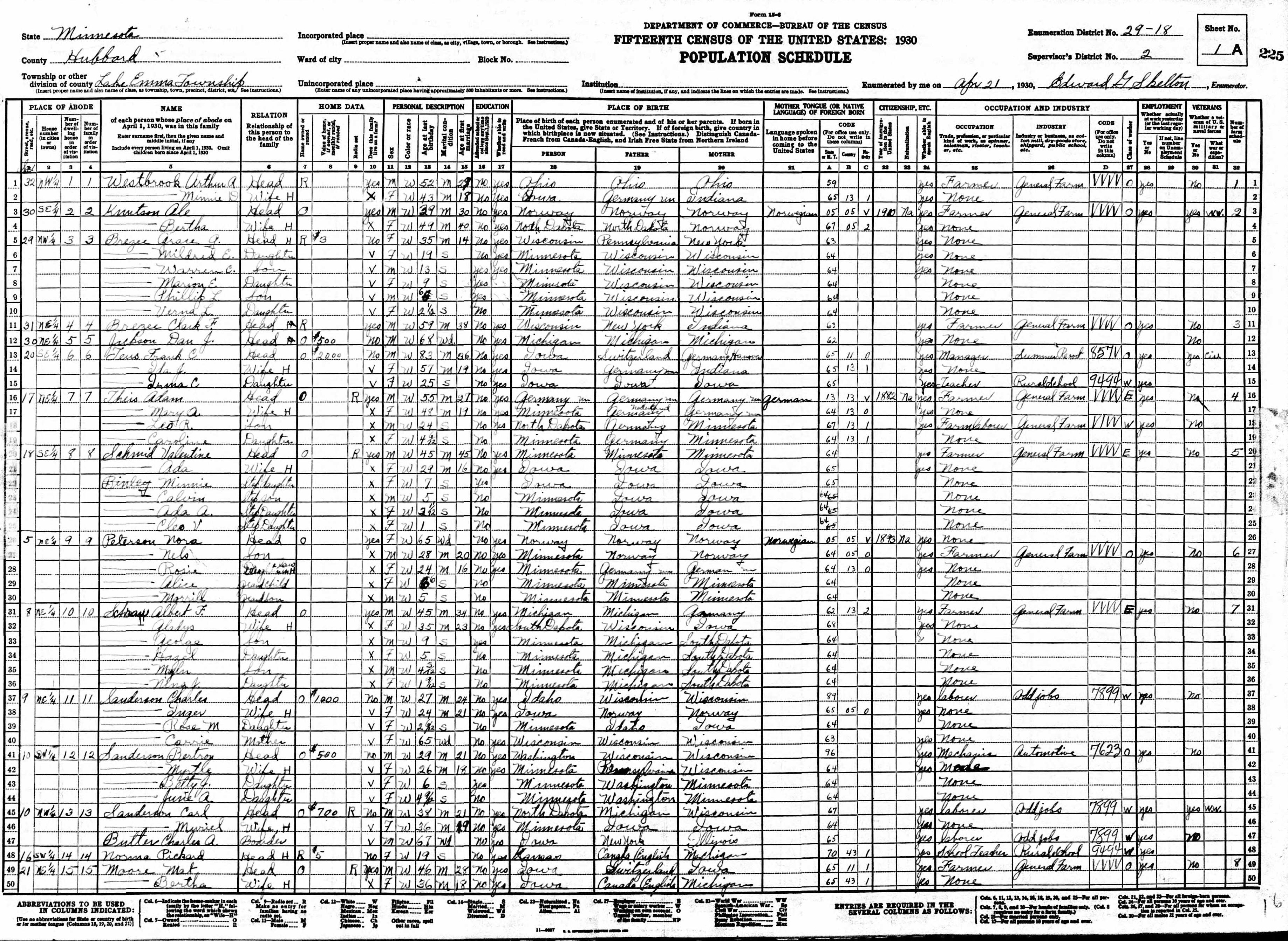 Westbrook Family 1930 Federal Census Minnesota, Lines 1-2