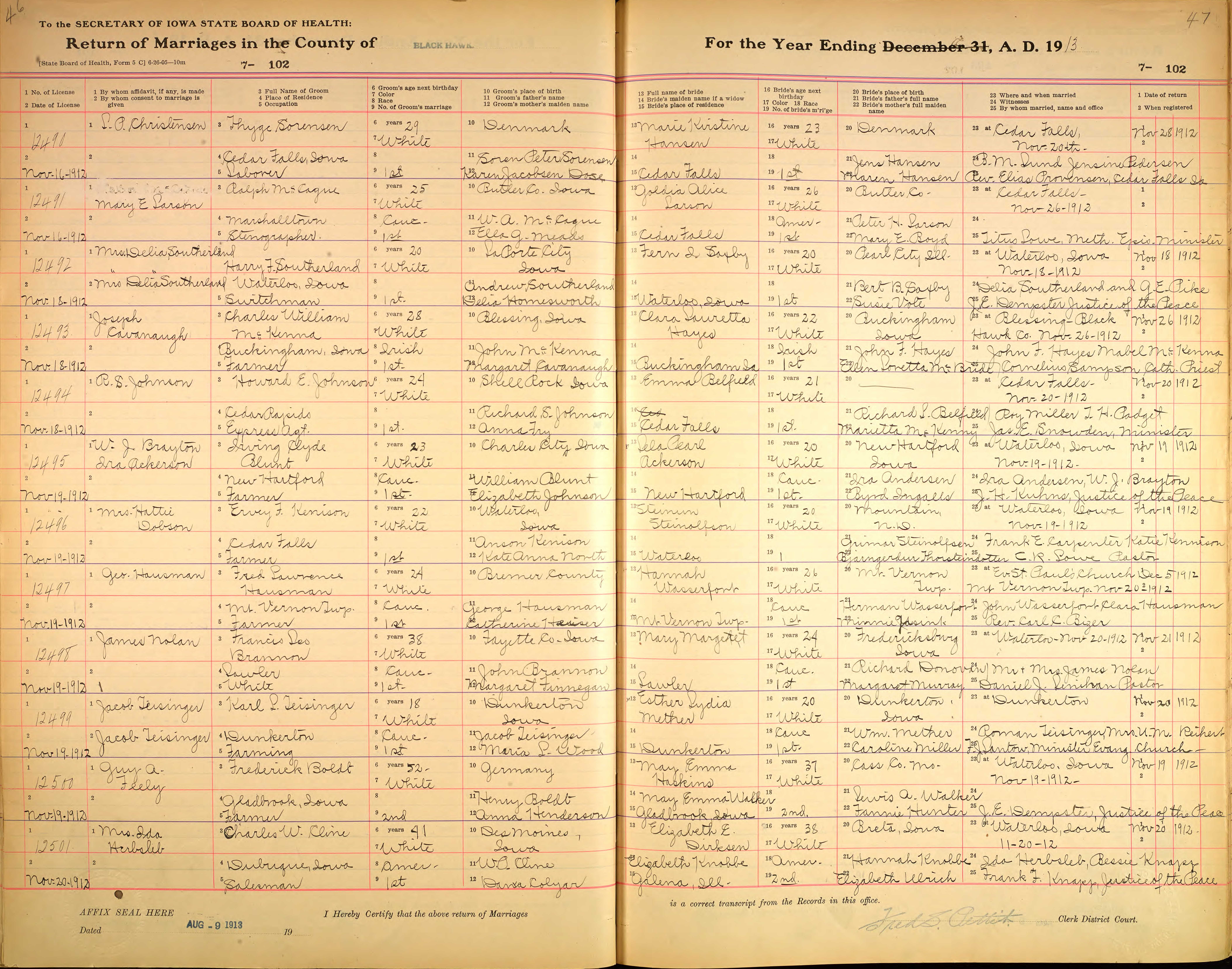 1912 Marriage Record, Lilne 12501