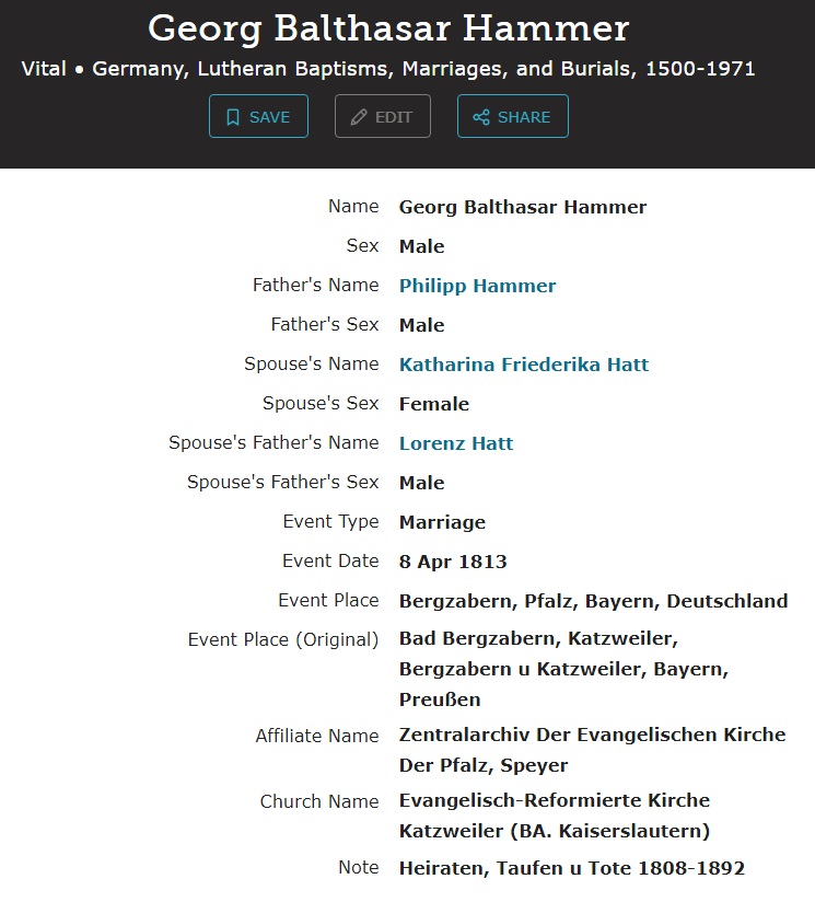 Catharina Friedericka Hatt were married on April 8, 1813 in Bad Bergzabern, Südliche Weinstraße, Rhineland-Palatinate, Germany. He died on March 21, 1852, at age 67, in Bad Bergzabern, Südliche Weinstraße, Rhineland-Palatinate, Germany.