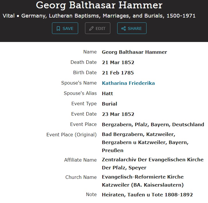 Georg Balthasar Hammer was born on February 21, 1785 in Bad Bergzabern, Südliche Weinstraße, Rhineland-Palatinate, Germany. He and