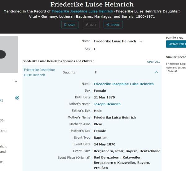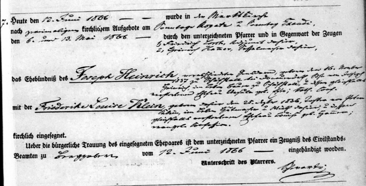 Joseph Heinrich were married on June 12, 1866 in Bad Bergzabern, Südliche Weinstraße, Rhineland-Palatinate, Germany. She died.