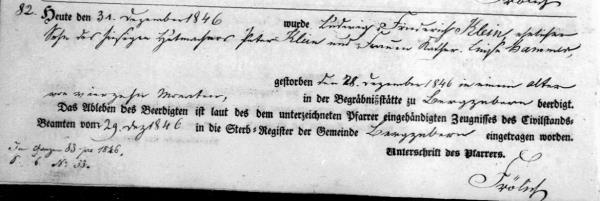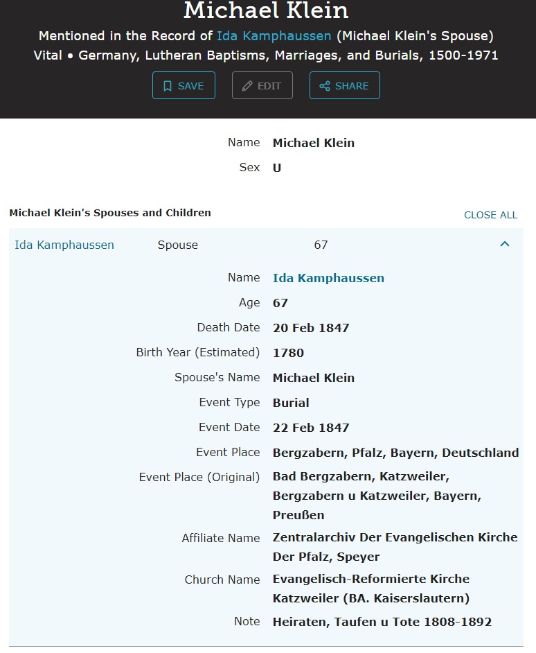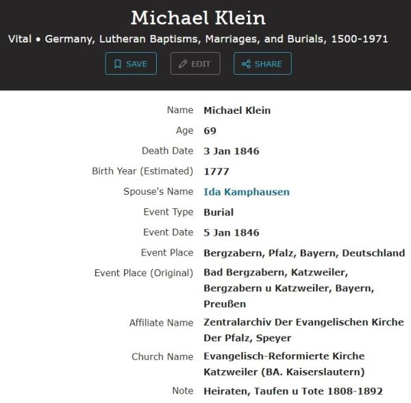 Michael Klein were married. She died on February 20, 1847, at age ~67, in Bad Bergzabern, Südliche Weinstraße, Rhineland-Palatinate, Germany.