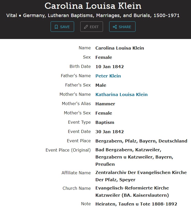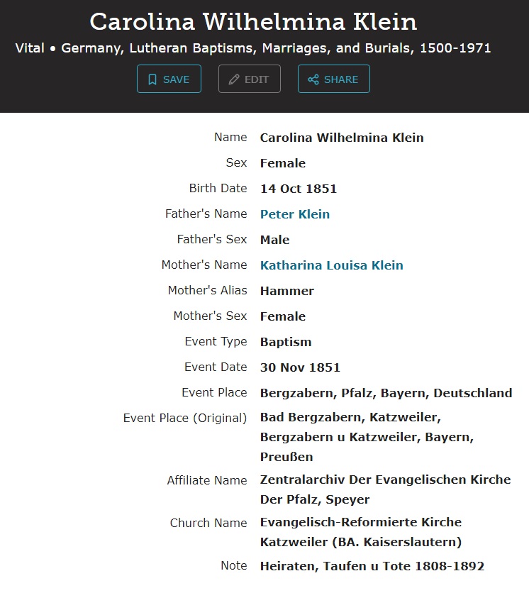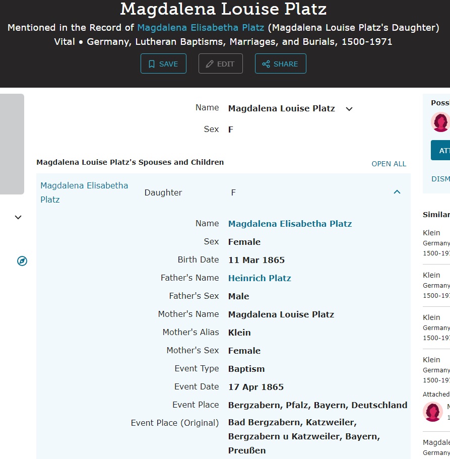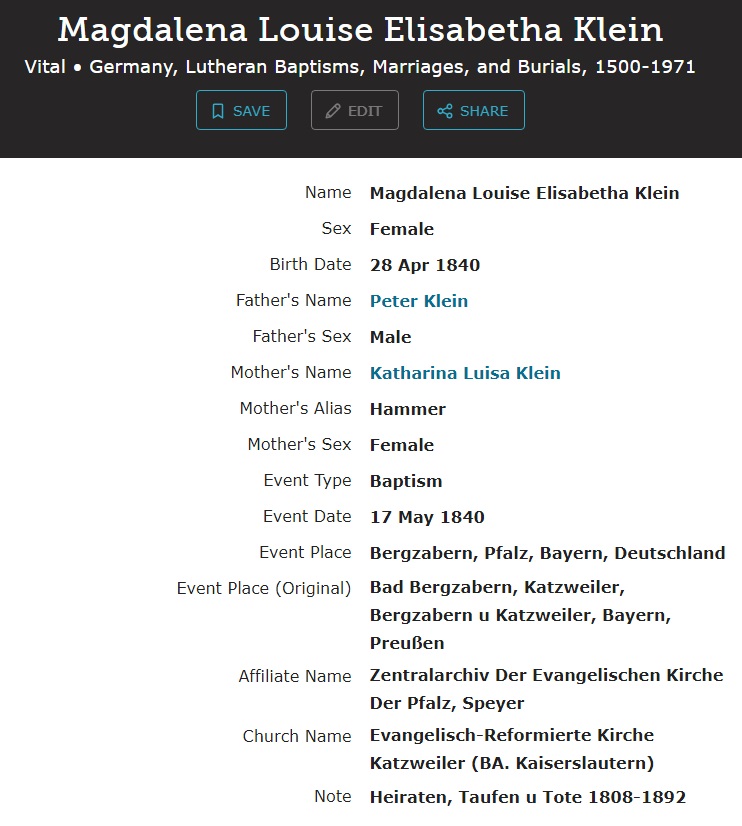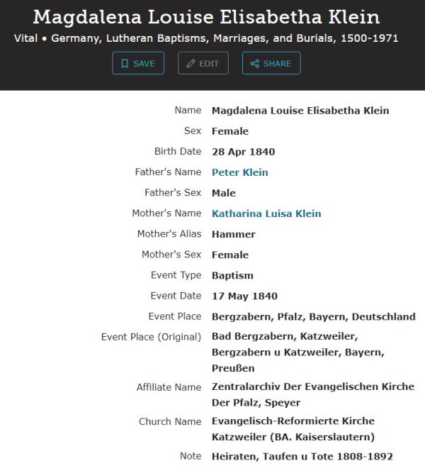 Magdalena Louise Elisabeth Klein was born on April 28, 1840 in Bad Bergzabern, Südliche Weinstraße, Rhineland-Palatinate, Germany. She and