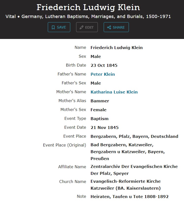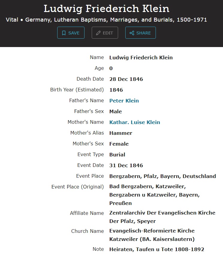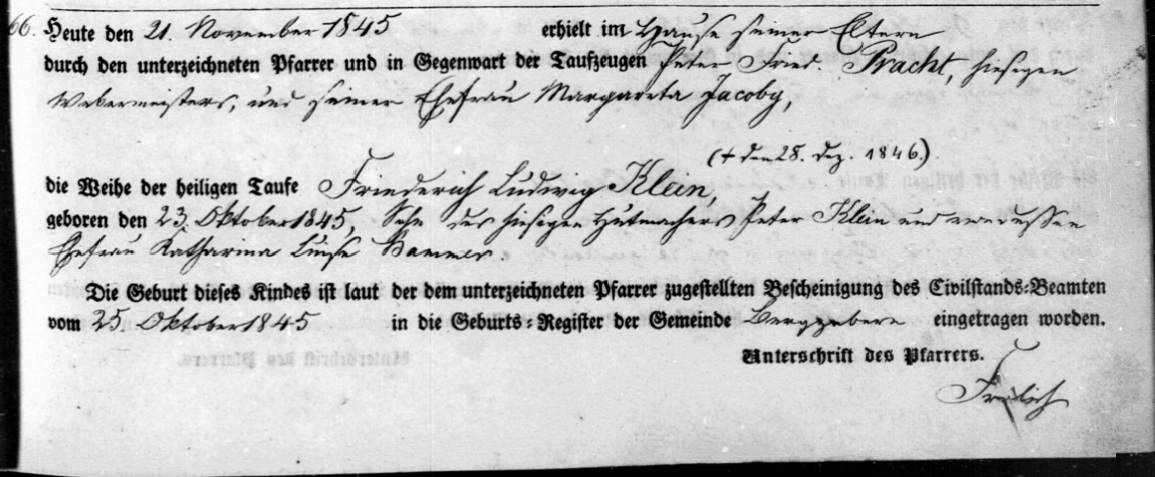 Friederich Ludwig Klein was born on October 23, 1845 in Bad Bergzabern, Südliche Weinstraße, Rhineland-Palatinate, Germany. He died on December 28, 1846, at age 1, in Bad Bergzabern, Südliche Weinstraße, Rhineland-Palatinate, Germany.