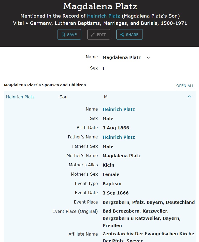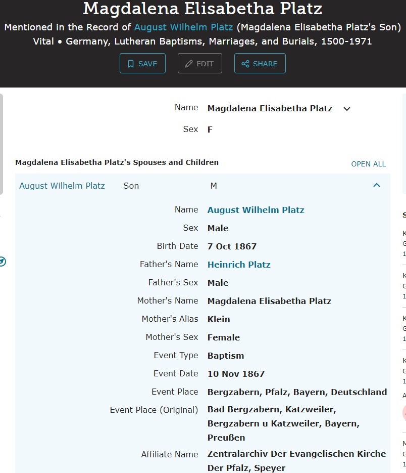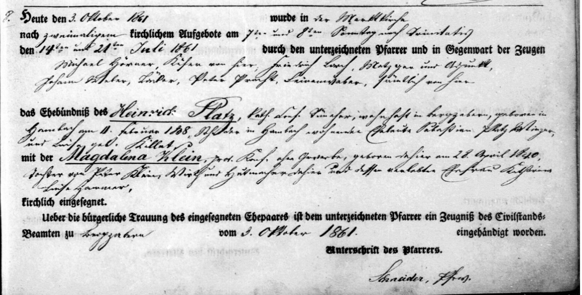 Heinrich Platz were married on October 3, 1861 in Bad Bergzabern, Südliche Weinstraße, Rhineland-Palatinate, Germany. She died.