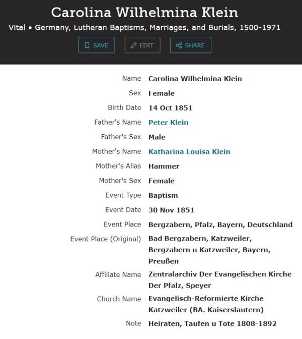 Carolina Wilhelmina Klein was born on October 14, 1851 in Bad Bergzabern, Südliche Weinstraße, Rhineland-Palatinate, Germany. She died.