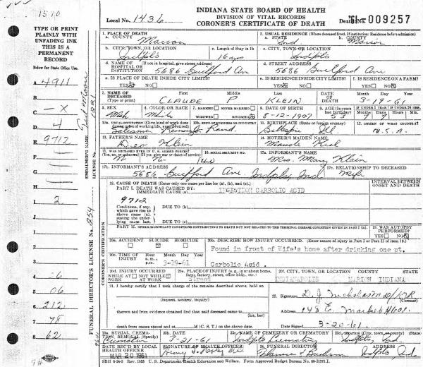 Claude P. Klein was born on August 12, 1907 in Gillespie, Macoupin, Illinois, USA. She died on March 19, 1961, at age 53, in Indianapolis, Marion, Indiana, USA. She was buried in Cremation: Ashes Location Unknown.