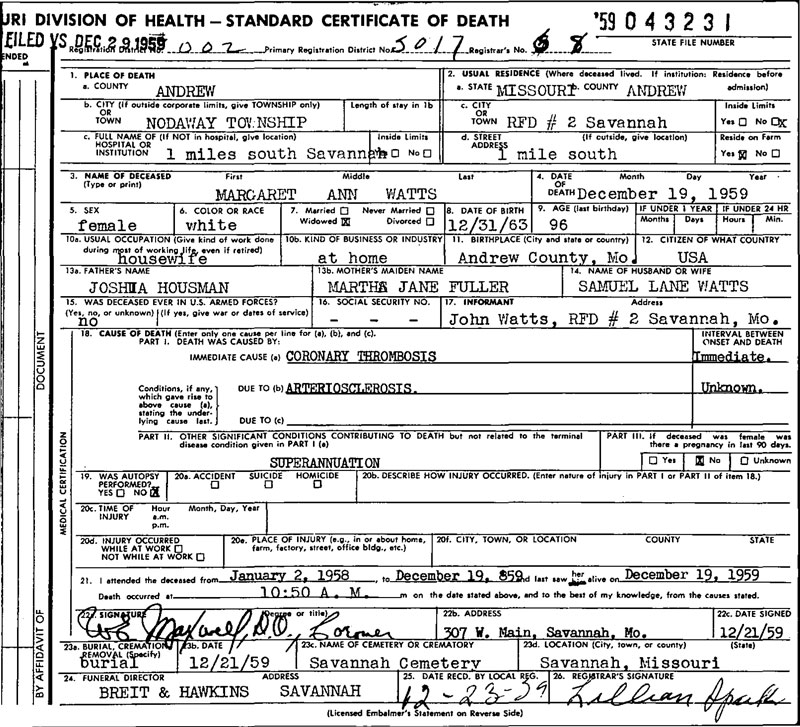 Samuel Lane Watts were married. She died on December 19, 1959, at age 95, in Nodaway, Andrew, Missouri, USA. She was buried in Savannah Cemetery, Savannah, Missouri.