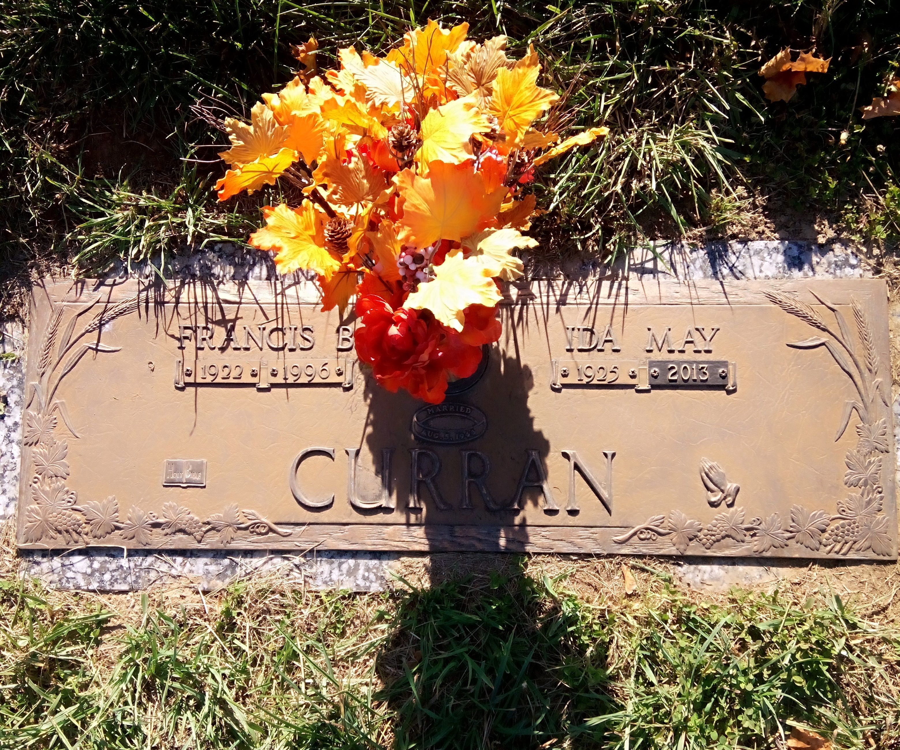 Francis Curran were married on August 5, 1944. She died on December 8, 2013, at age 88, in Savannah, Andrew, Missouri, USA. She was buried in Mount Olivet Cemetery, Saint Joseph, MIssouri.