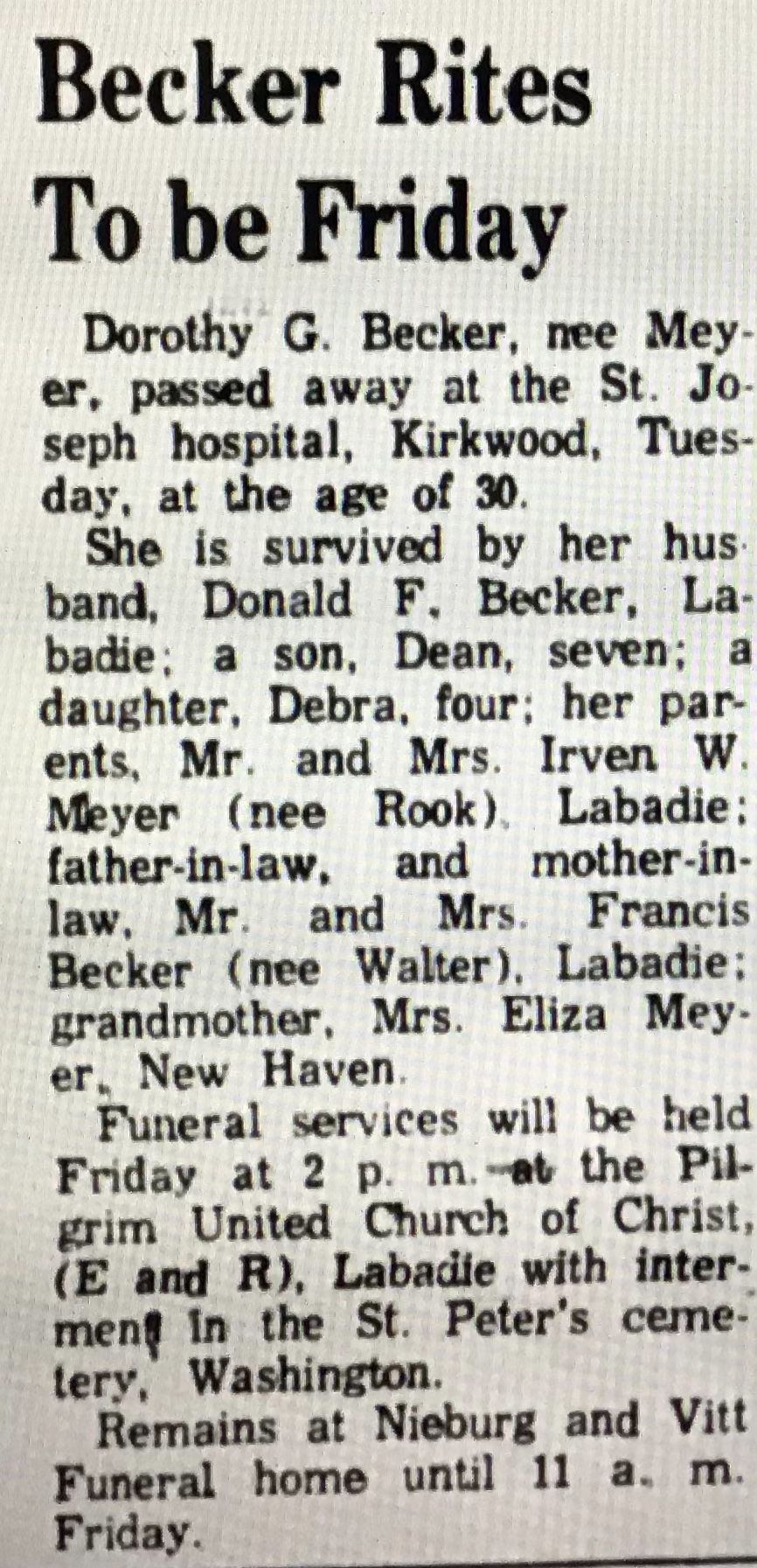 Donald Francis Becker were married in 1949. She died on January 2, 1962, at age 30, in Kirkwood, St. Louis, Missouri, USA. She was buried in Saint Peter's Cemetery, Washington, Missouri.