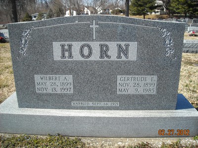 Wilbert August Horn were married. She died on May 9, 1985, at age 85. She was buried in Saint Peter's Cemetery, Washington, Missouri.