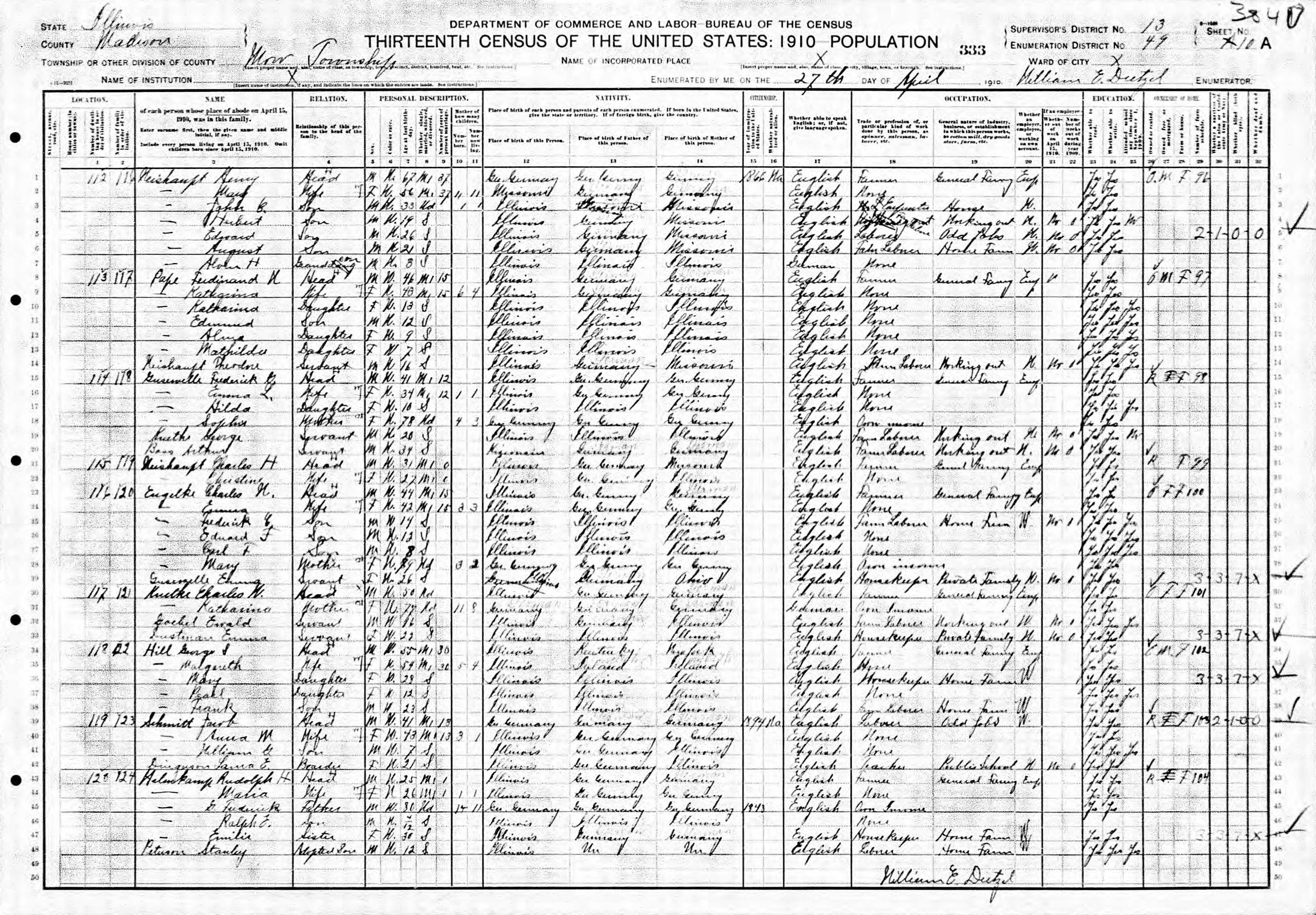 Helmkamp Family 1910 Federal Census Illinois, Lines 43-48
