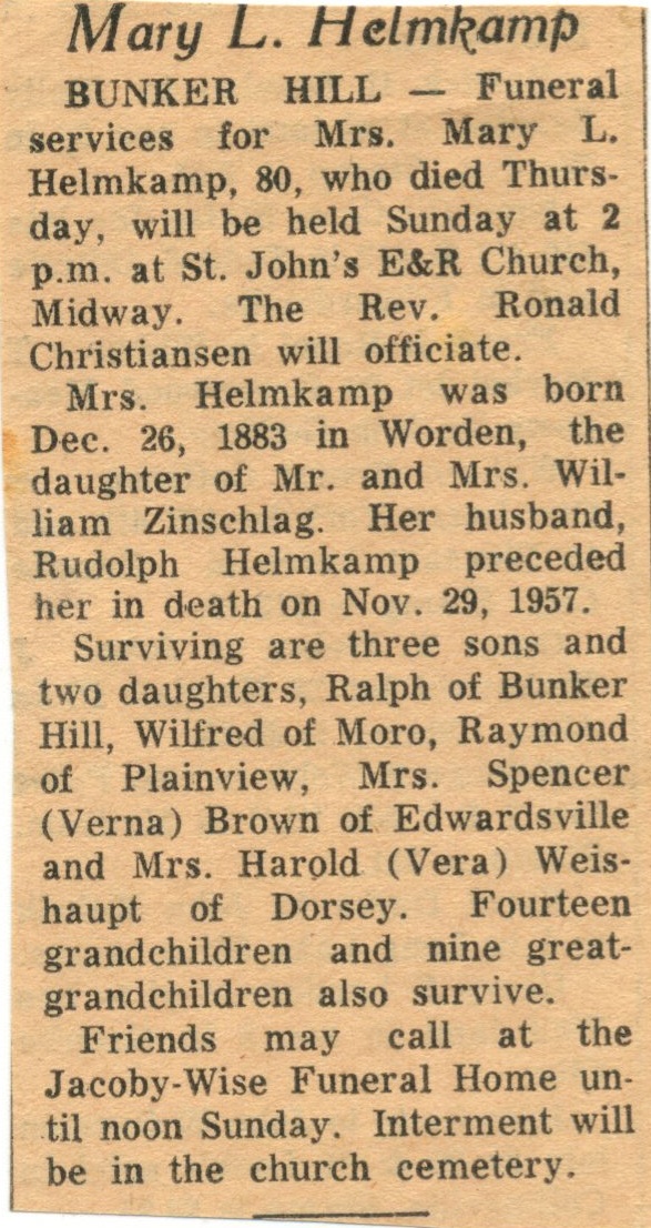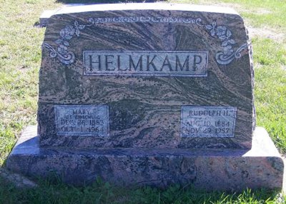 Rudolph Henry Helmkamp were married on April 13, 1909 in Madison, Illinois, USA. She died on October 1, 1964, at age 80, in Bunker Hill, Macoupin, Illinois, USA. She was buried in Saint John United Church of Christ Cemetery, Midway, Illinois.