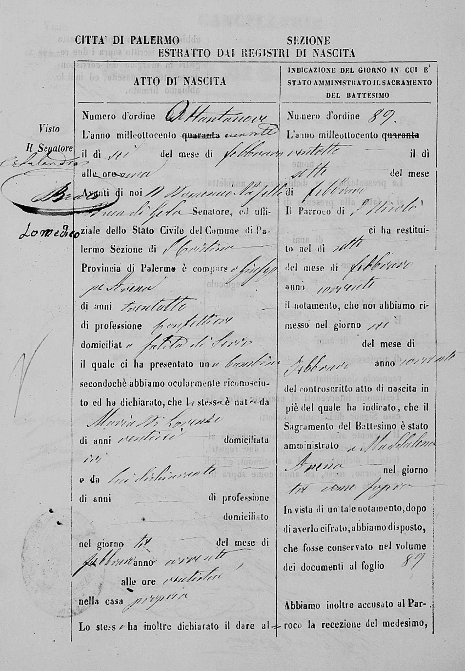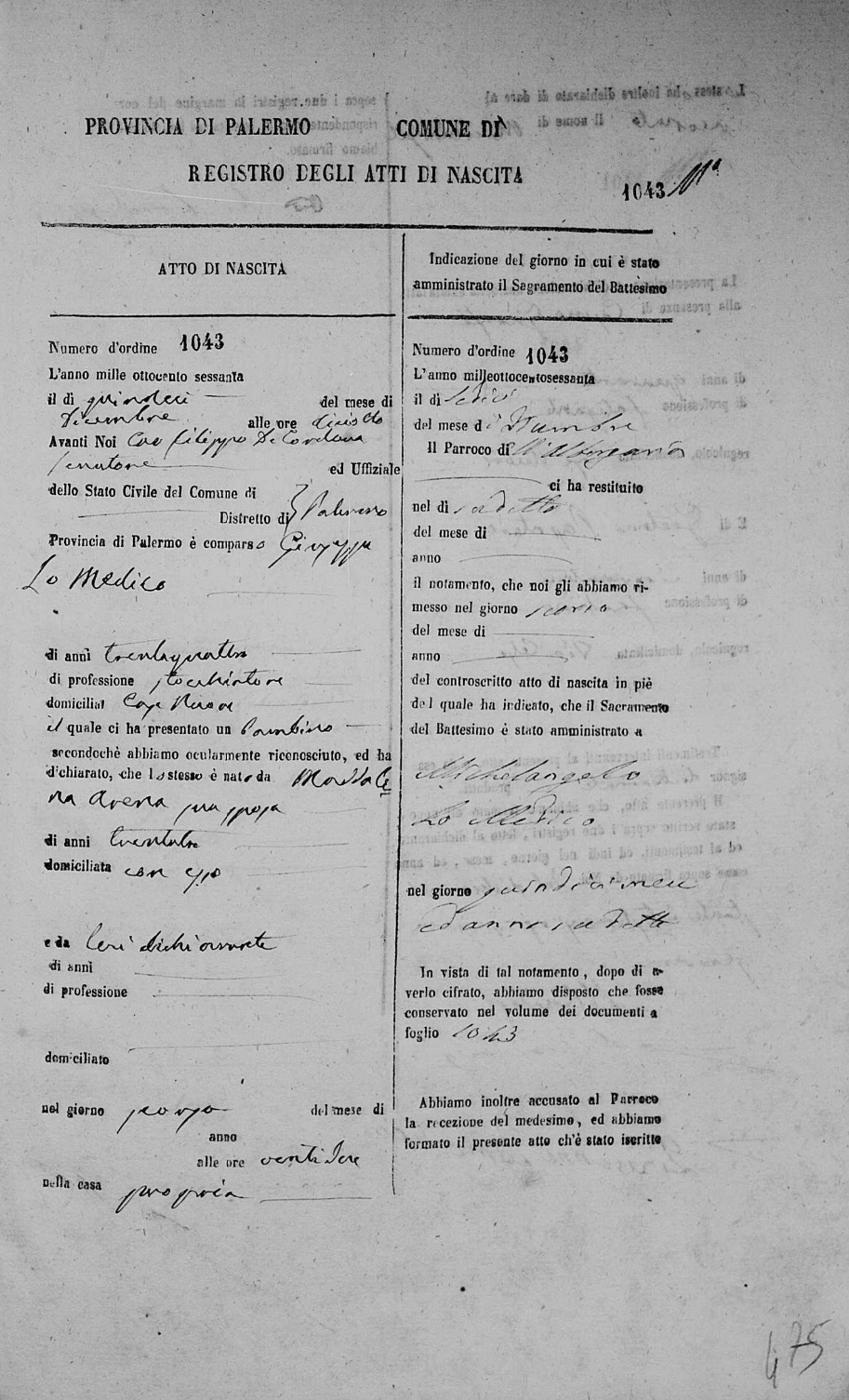 Giuseppe Lomedico was born on October 23, 1827 in Santa Cristina, Palermo, Sicilia, Italy. He and
