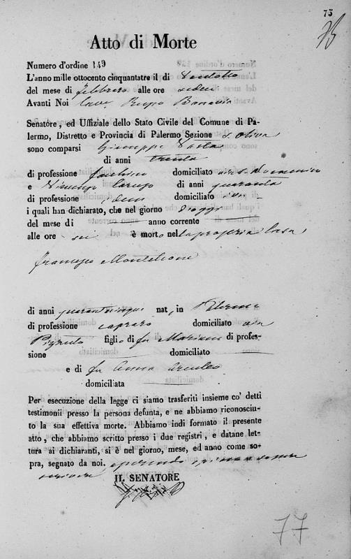 Carmela Amoroso were married on February 22, 1840 in Oreto, Palermo, Sicilia, Italy. He died on February 28, 1853, at age ~41, in Sant'Oliva, Palermo, Sicilia, Italy.