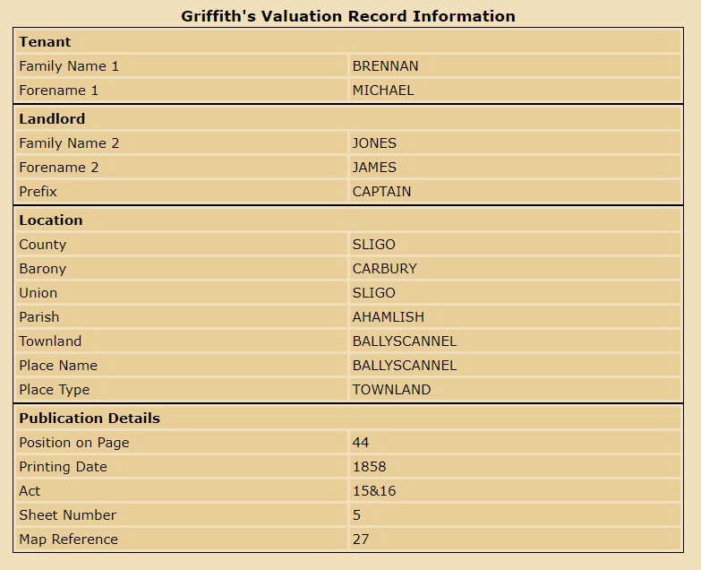 Michael Brennan Map Reference in the Parish Ahamlish, Ballyscannel, Ireland